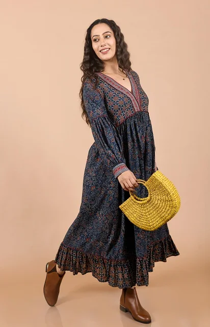 Luxurious Cotton Hand Block Printed Fabric Dress With V Neckline Long Sleeve & Pockets Maxi Standard Dress Summer Women Clothing