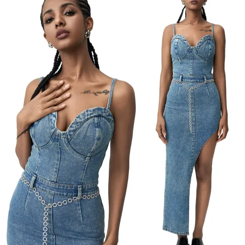 New Slim and Sexy Suspender Dress Tight Fitting Denim Dress With Split Hem Washed Denim Dress