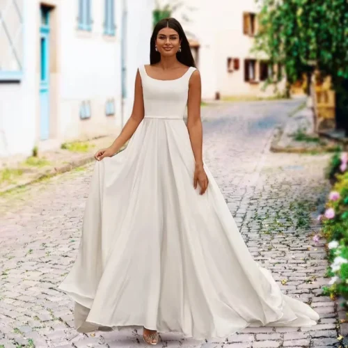 Simple Elegant Wedding Dress Boat Neck Satin Bridal Gown Sleeveless Wedding Dress