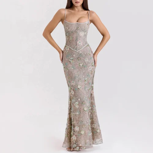 Silver Beaded Corset Maxi Dress Women Elegant Embellished Evening Gown Formal Wear Party Dress