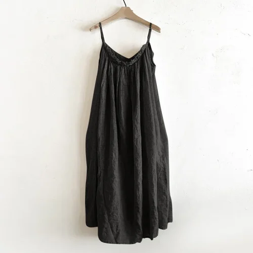 Summer Free Size A-line Loose Vintage Casual Sleeveless Solid Color Crew Neck Simple 100 % Pure Linen Black Maxi Long Dress