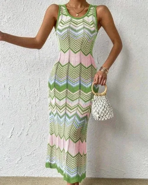Summer Knitted Beach Dresses Splicing Stripe Sleeveless Summer Women Knitted Dress Holiday Sundress Hollow Out Long Dresses