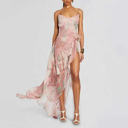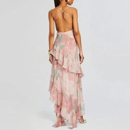 Summer Sexy Spaghetti Strap Printed Ruffles Long Dress Women Pink Sleeveless Backless Draped Dresses Holiday Party Sundress