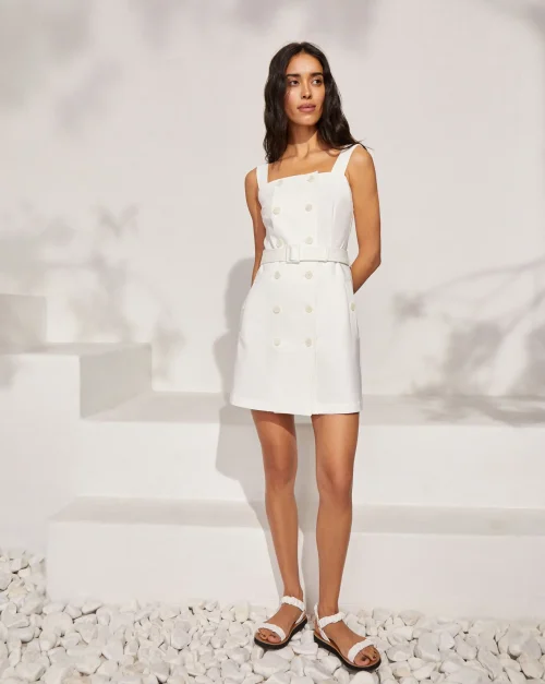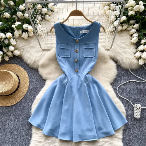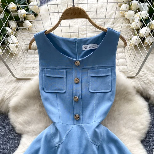 Summer Safari Style Sleeveless Double Breasted Plain Mini Sundress Dress With Belt for Women