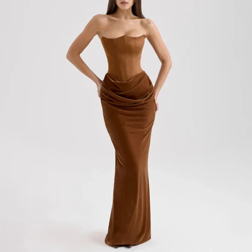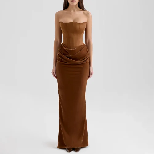 Toffee Velvet Strapless Corset Maxi Dress for Women Elegant Evening Gown Formal Party Dress