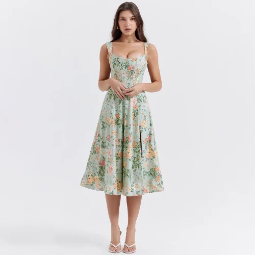 Sweet Summer Floral Print Casual Dresses Slim Waist Lace up Pockets Hidden Zippers Midi a Line Vacation Sundress