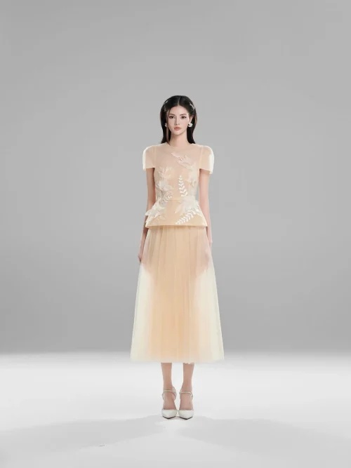 Vietnam 2025 Niche Brand High Waist Mesh Pleated Long Skirt Floral Embroidery Elegant Party Dresses Ladies Two-Piece Set