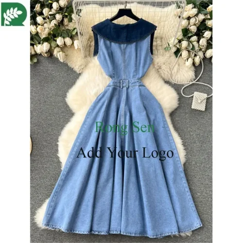 Vintage Casual Sexy Sleeveless Button Style Neck One Piece Split Jeans Skirts Midi Long Sundress Denim Women Dresses
