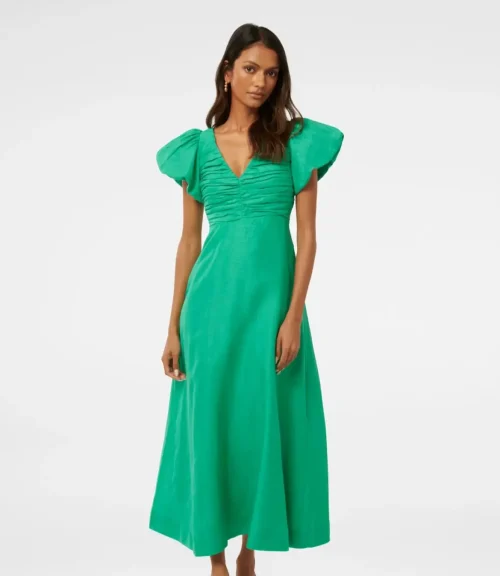 New Green Pure Linen June Petite Ruched Midi Dress Korean Long Beach Solid Plain Dress for Women