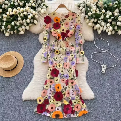 ODM Vintage Three-Dimensional Flower Decoration Maxi Lace Dresses Elegant Women’S Boutique Embroidery Long Fishtail Dress