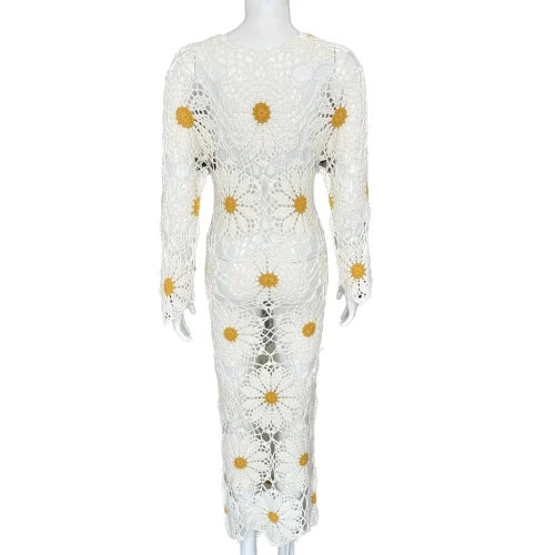 2024 Premium Daisy Long Sleeve Crochet Maxi Dress for Women Floral Patchwork Hollow Sexy Cover-Up for Summer Beach Vacation