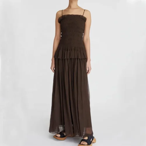2024 New Arrival Women Smocked Chic Sling Long Resort Dress Elegant Ruffled Neck Double Strap Casual Women Dress