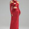 Women’s Long Sleeve Red Lace Dress with Embroidered Flower Hollow Design for Autumn/Winter Elegant Evening Wear