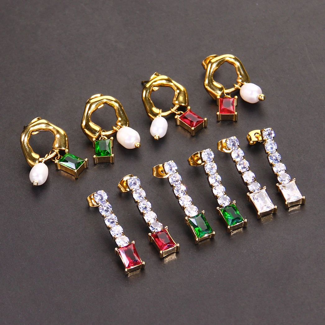 18K Gold Plated Stainless Steel Stud Earring Tennis Chain Pendant Ins Iced Cubic Zirconia Classic Geometric Design for Weddings