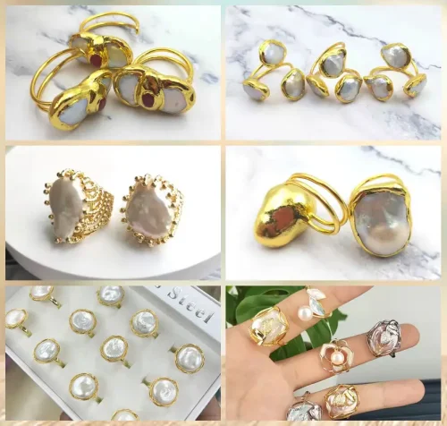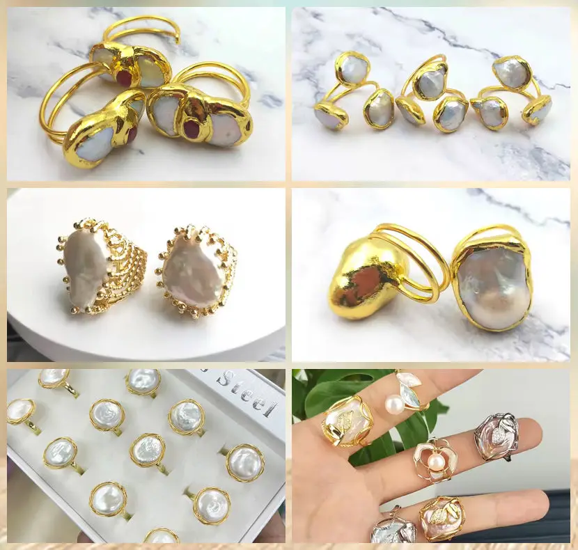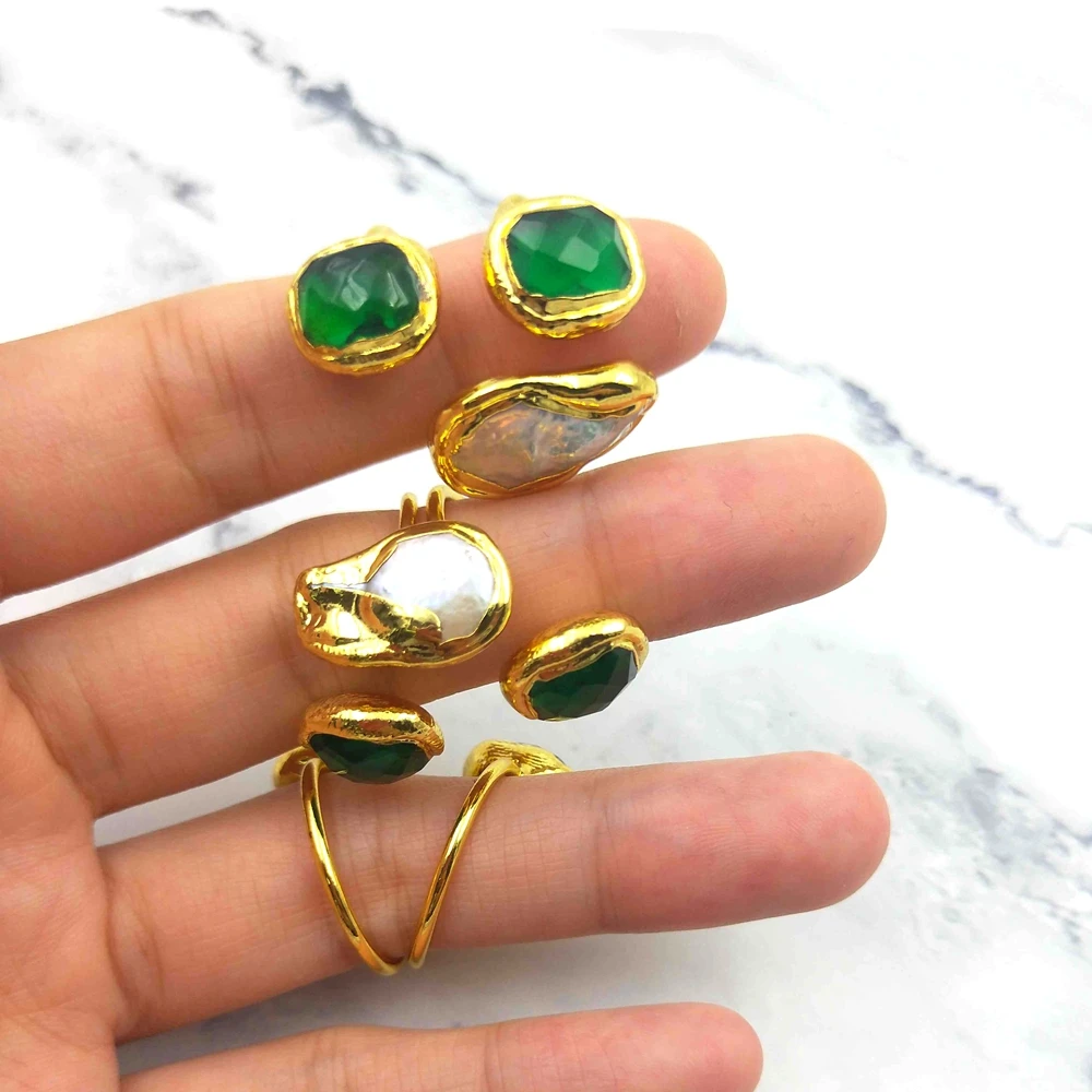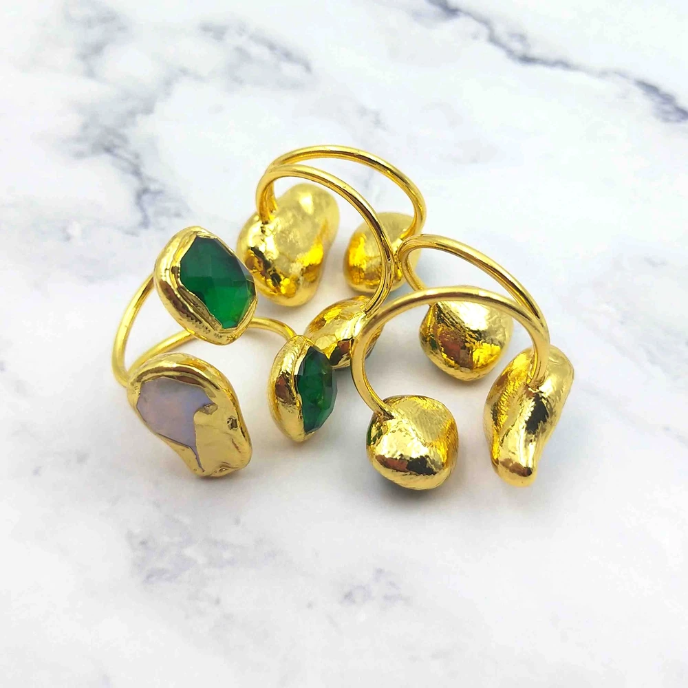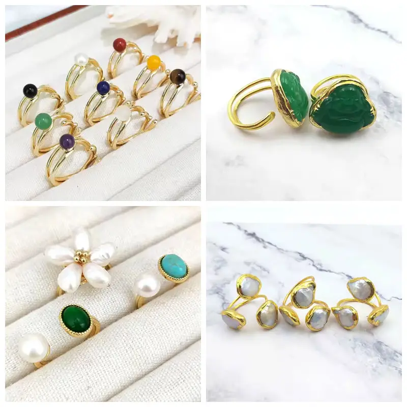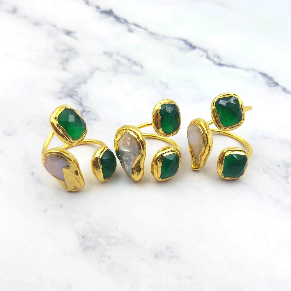 18K Gold Plated Triple Stone Resizable Rings Green Jade and White Pearl Unisex Healing Gemstone Solid Golden Ring Fine Jewelry