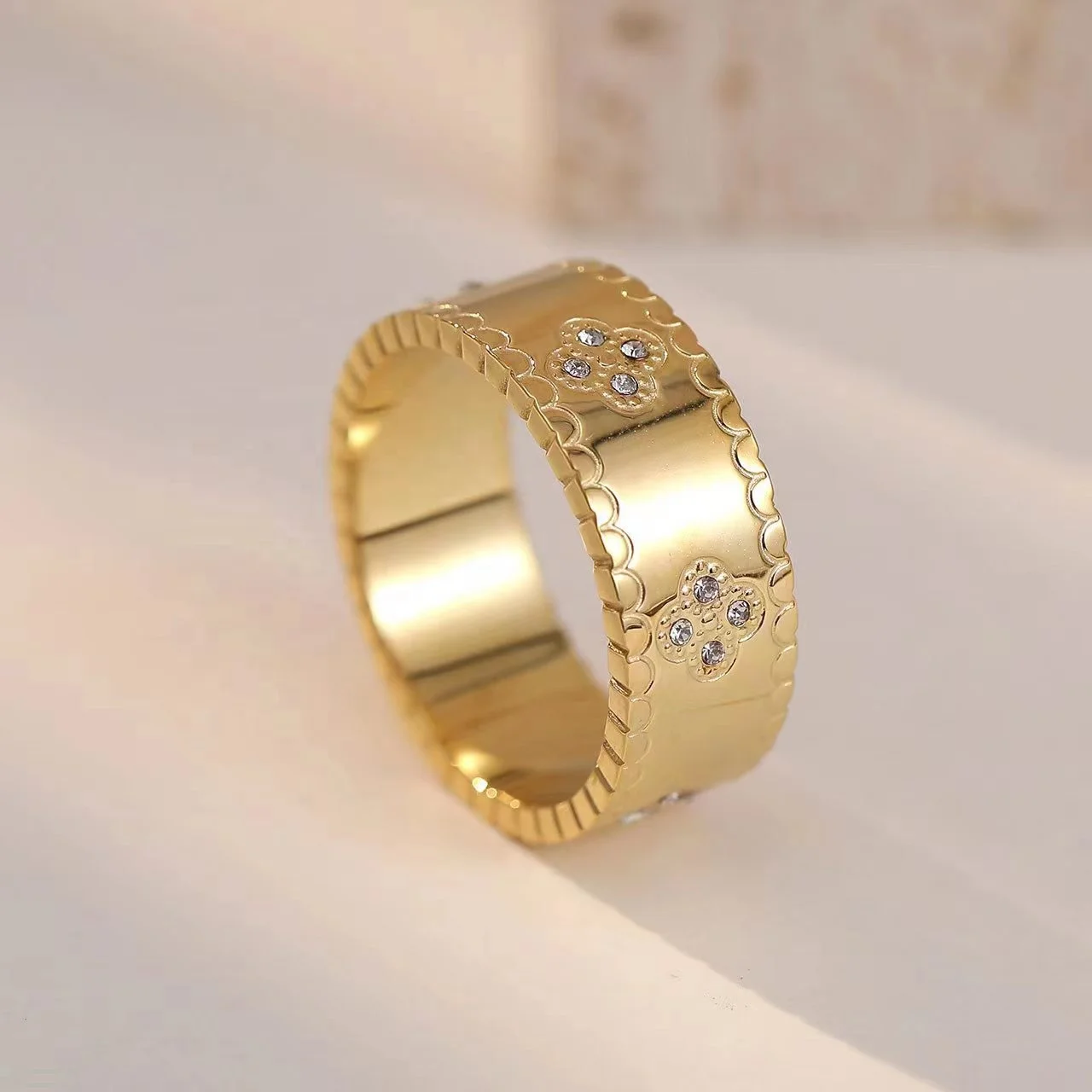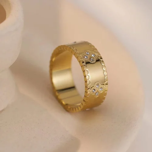 Product Name: 18K Stainless Fashionable Engagement Waterproof Jewelry Exquisite Zircon Flower Design Four Leaf Clover Lucky Thick Ring