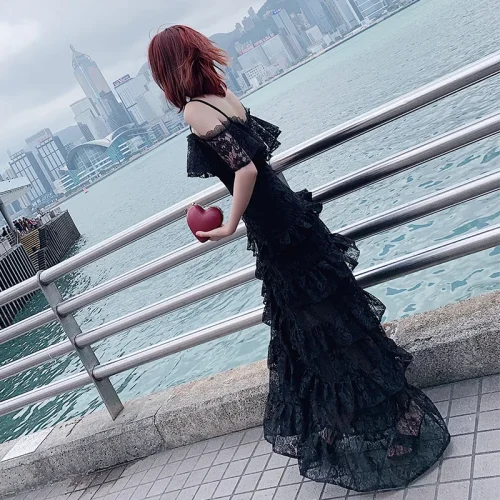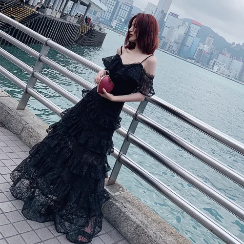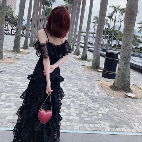 Product Name: 2019 Summer Black Lace Dress Tiered Skirt Self Tie Shoulder Straps Midi Casual Female Dresses