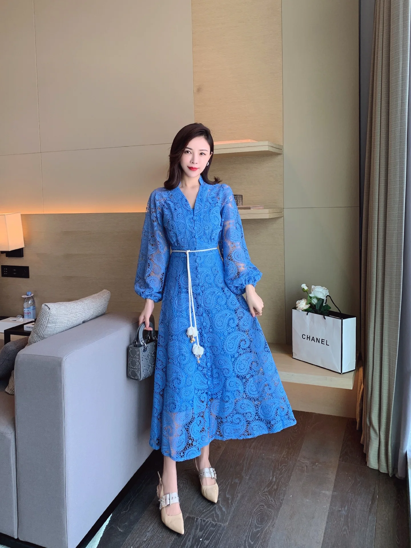 2022 Women Long Lace Hollow-out Lantern Sleeve Dress With Belt Dresses for Women
