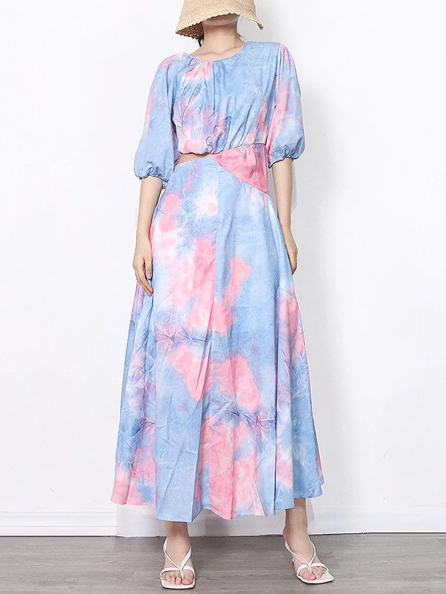 Product Name: 2023 European and America Sexy Backless Women O-Neck Tie Dye Dress Slim Waist Holiday Casual Maxi Dress Autumn