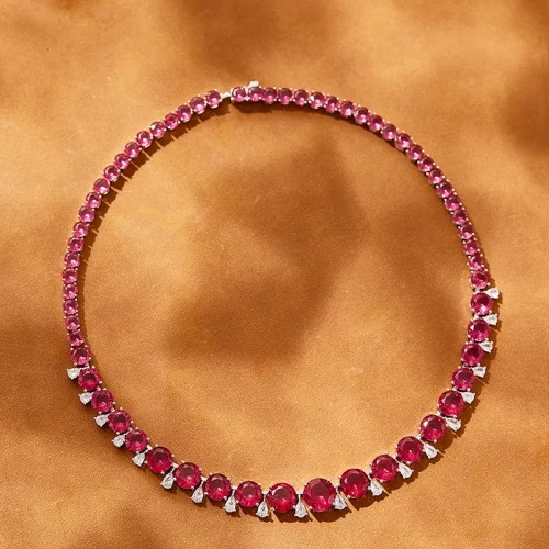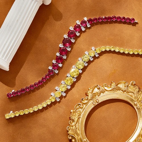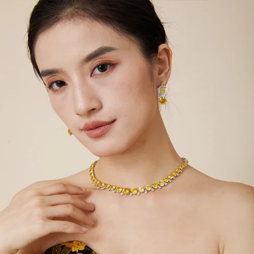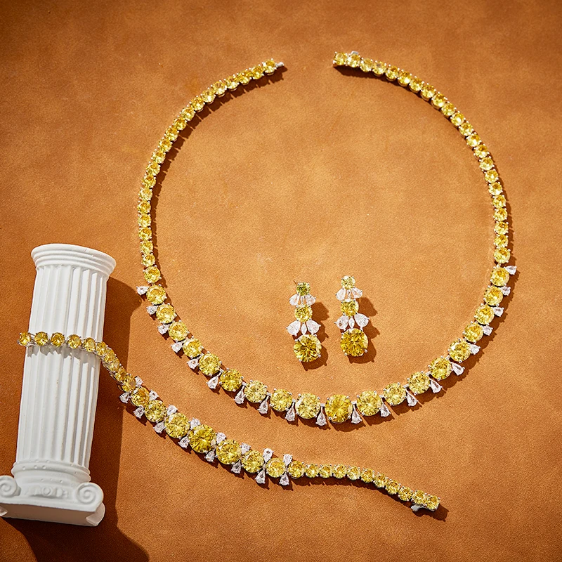 Product Name: 2024 New Classic Brass Red Yellow Single Row Zircon Necklace Earrings Bracelet Set, Suitable for Women’s Weddings and Engagement