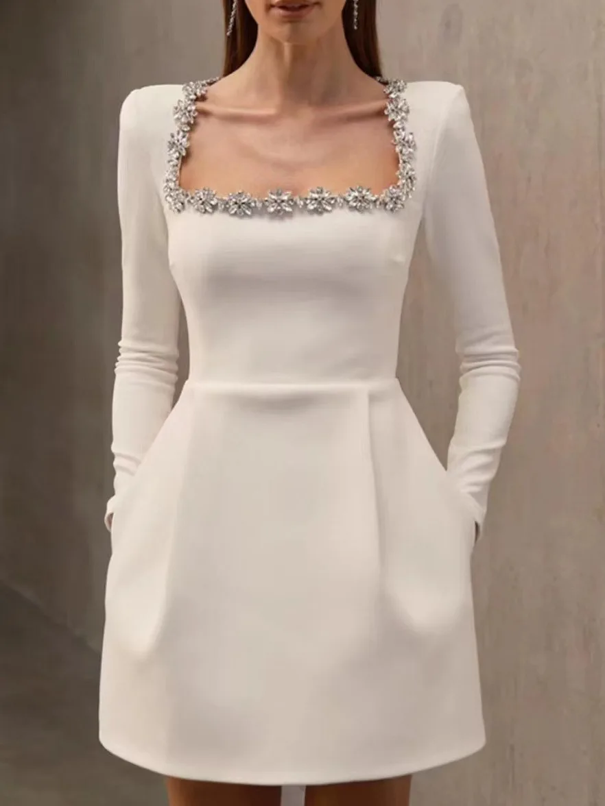 Product Name: 2025 Early Autumn New Square Collar Beaded French Dress for Women Casual Beading With Solid Pattern Office Lady