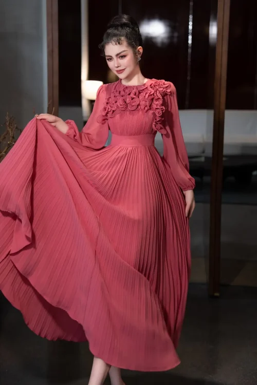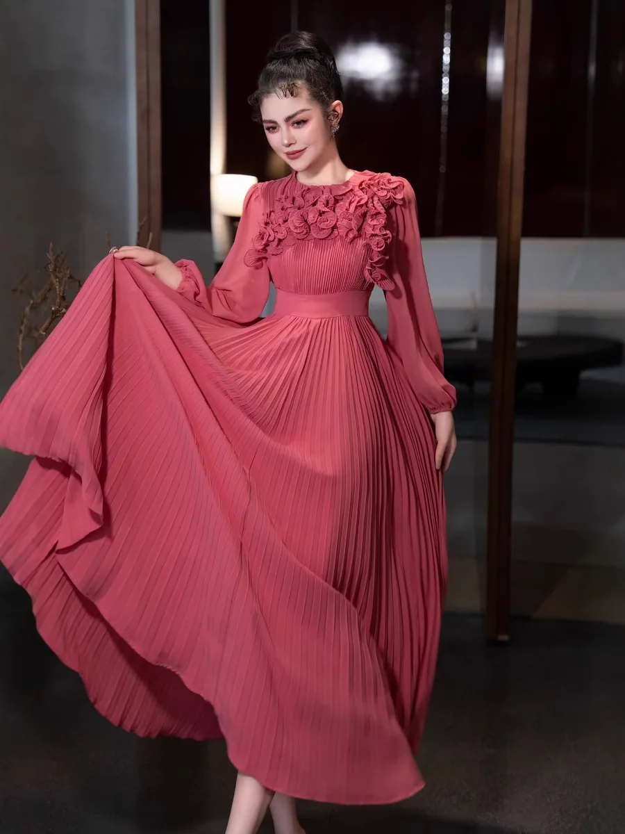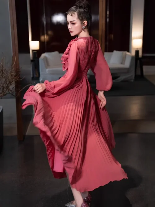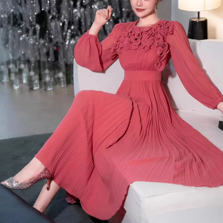Product Name: 2025 Early Spring Women’s Elegant French Pleated Dress Casual Chic New Wooden Ear Three-Dimensional Flower Lantern