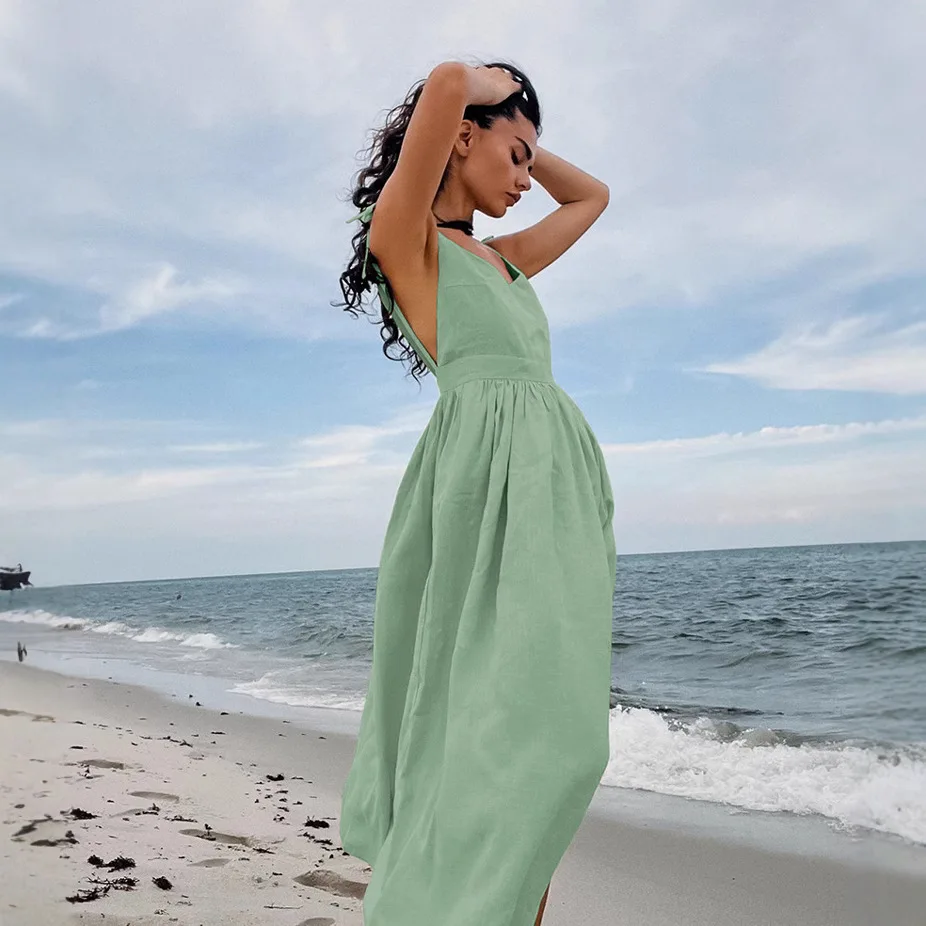 Product Name: 2025 European American Spring New Vacation Style High Waist Dress for Women French Style Khaki Cotton Linen Solid Lace