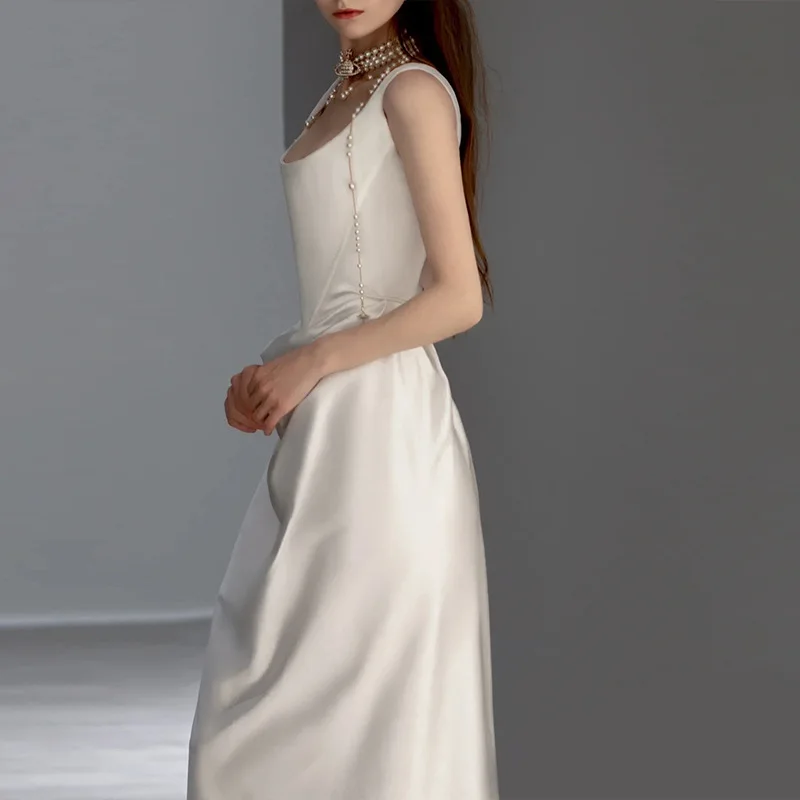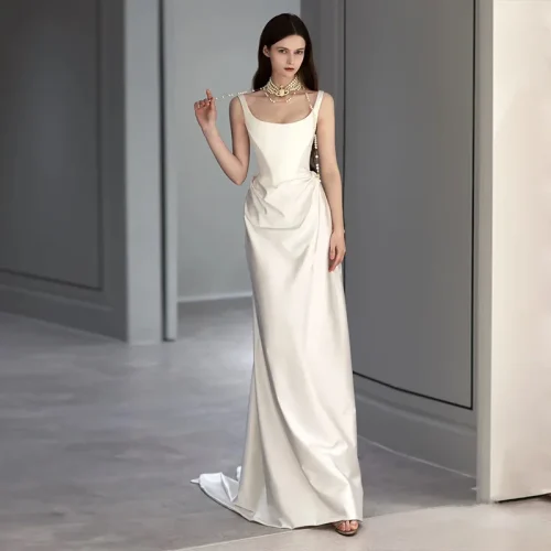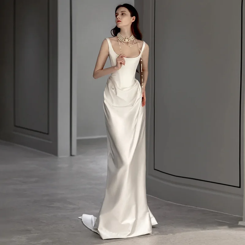 Product Name: 2025 Retro Simple Satin Light Wedding Dress with Chapel Train for Bride Evening & Veil Small Tail Suspender Dress
