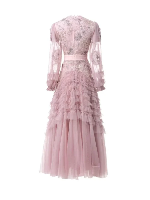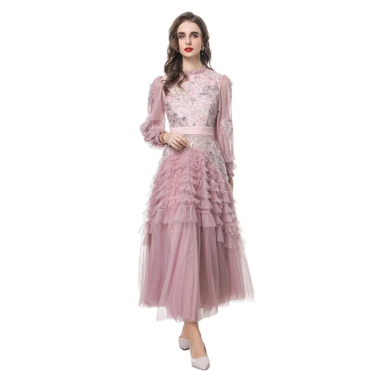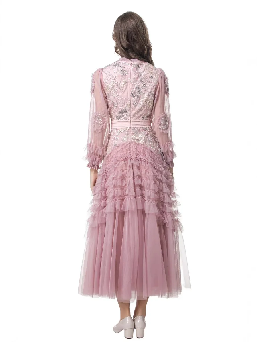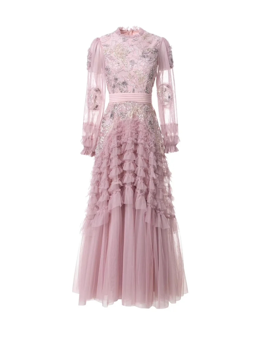 Product Name: 2025 Spring Summer Collection Elegant Vintage Maxi Dress Lace Neck Gauze Translucent Wood Ear Embroidery Sequins Casual