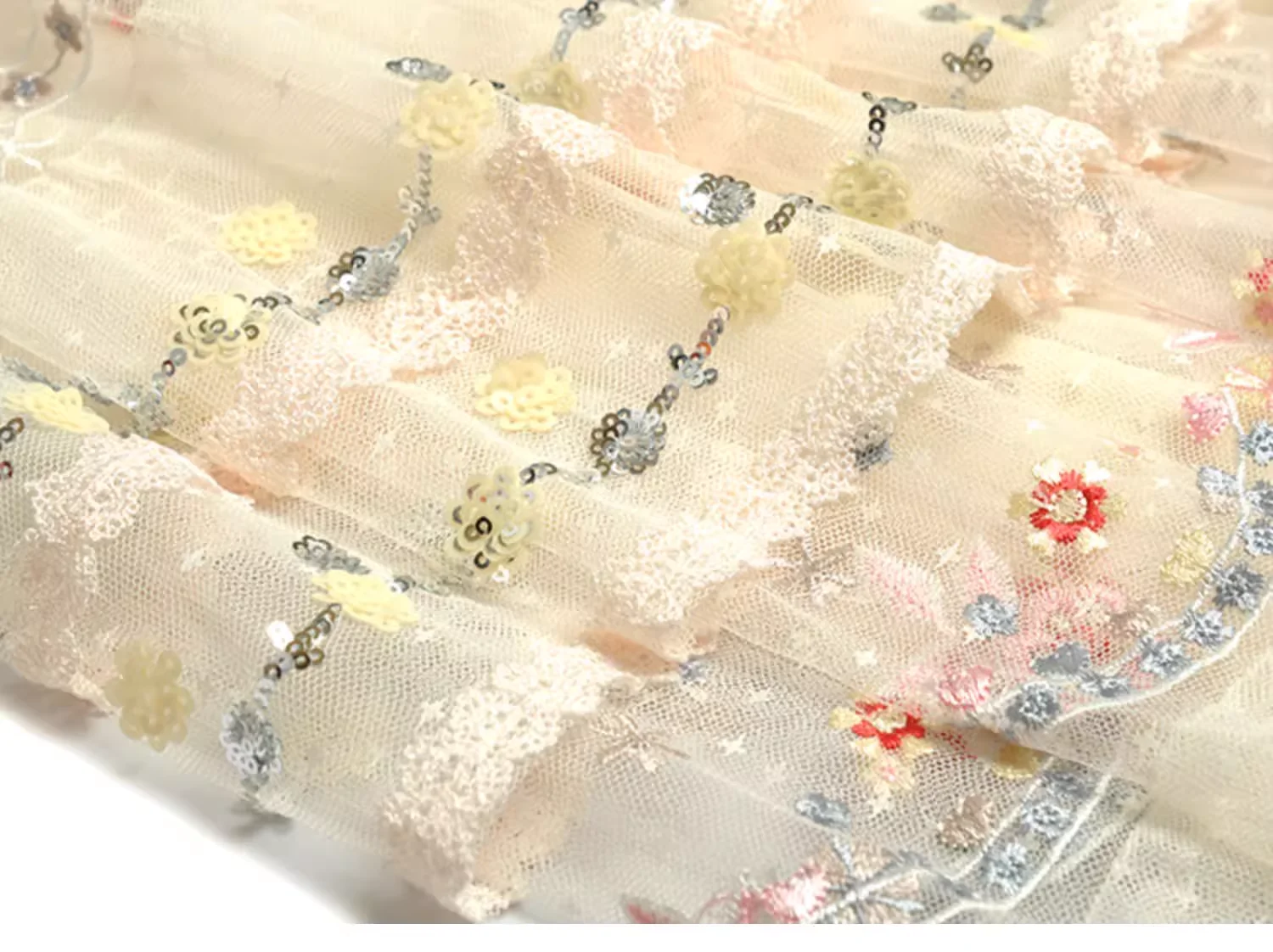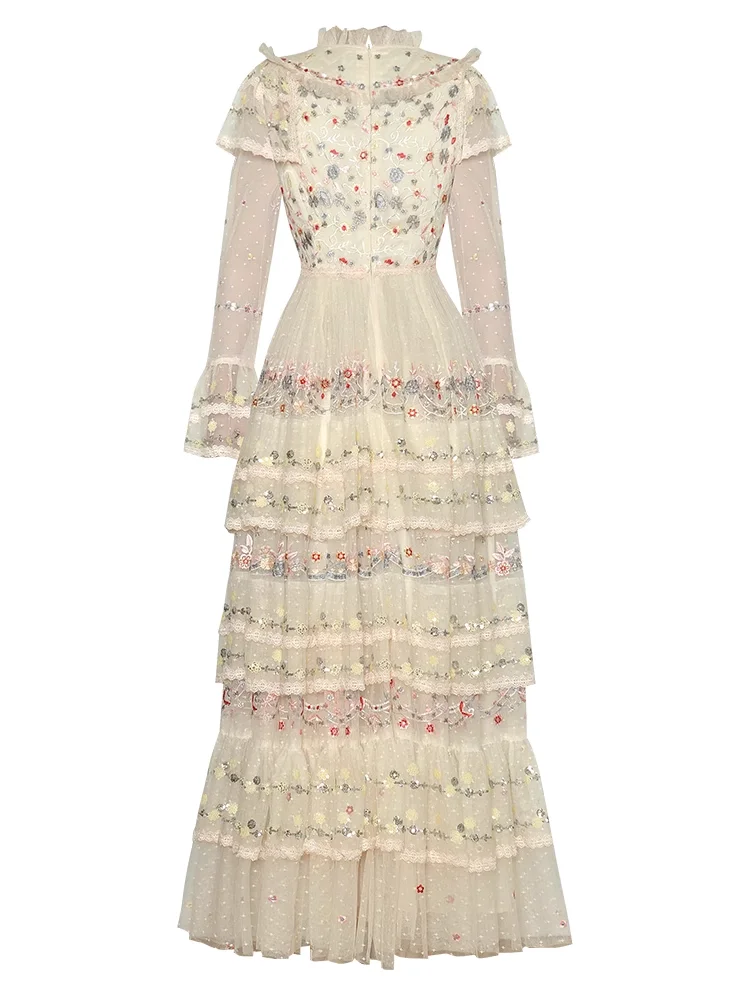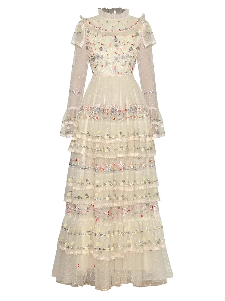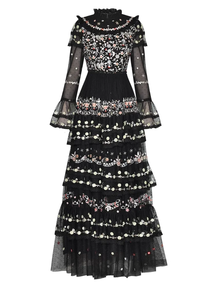 Product Name: 2025 Spring Summer New Fashion Design Women Runway High Street Long Dress Retro Embroidery Flower Mesh Ruffles A-Line Party