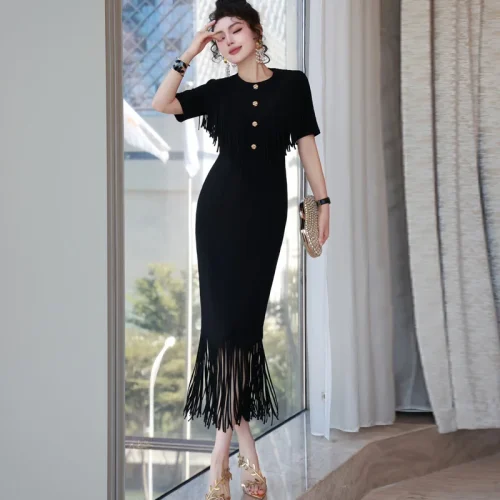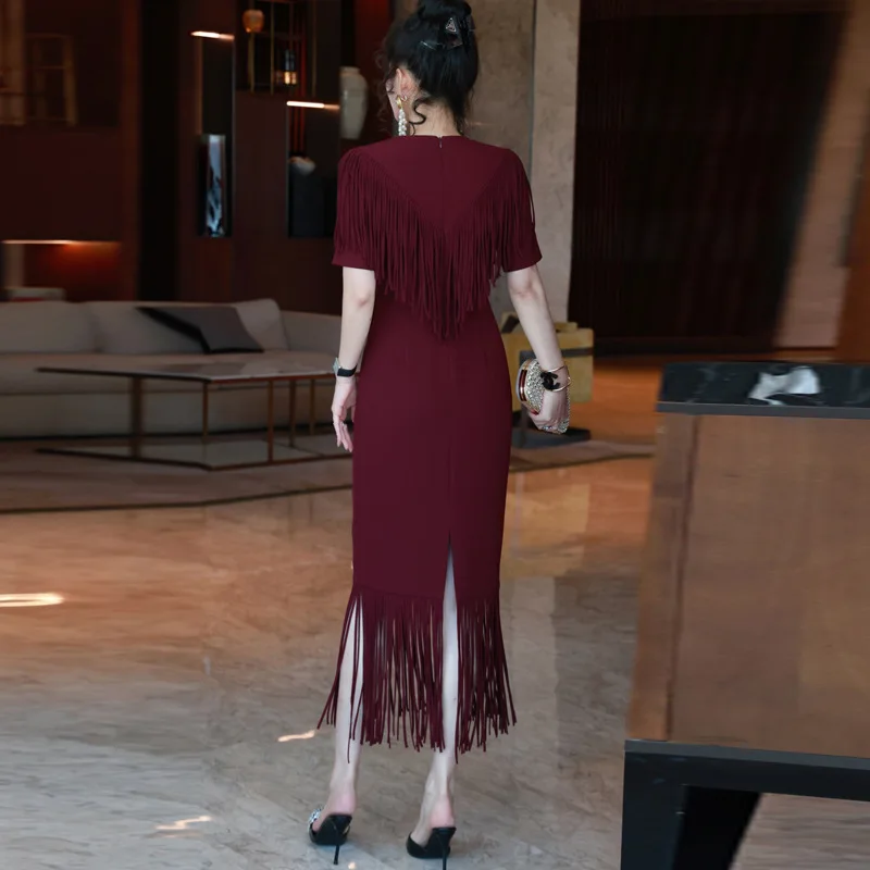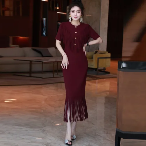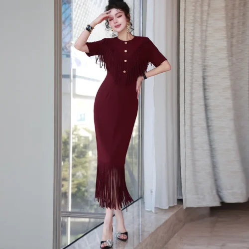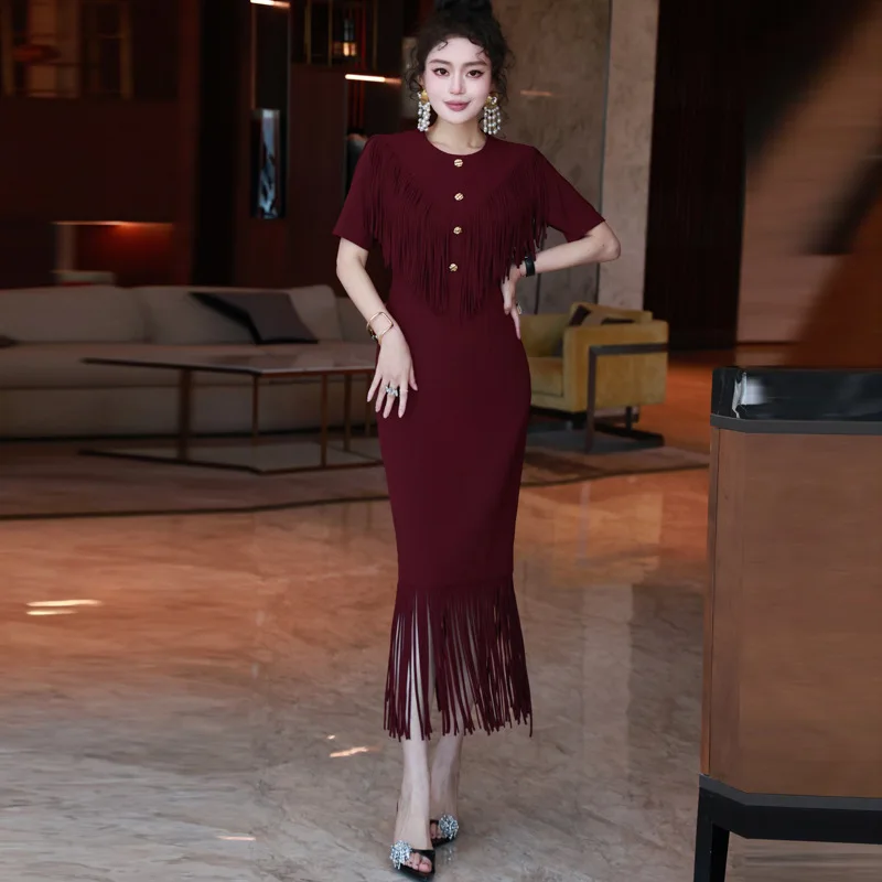2025 Summer European American Women’s Elegant Purple Floor-Length Dress Hip-Hugging Short-Sleeved Slimming Look with Tassel Neck