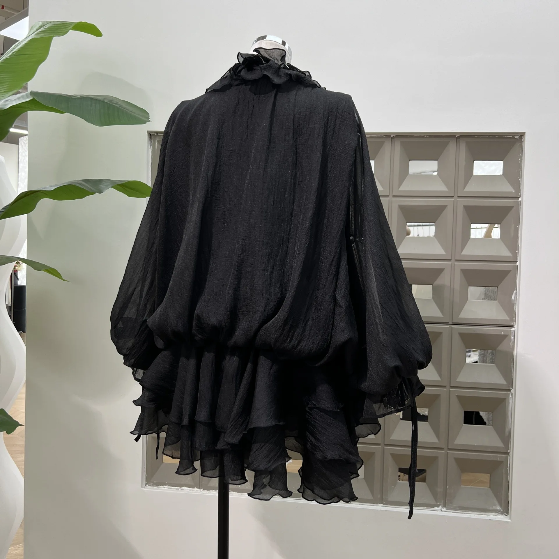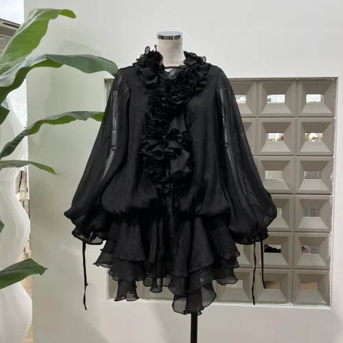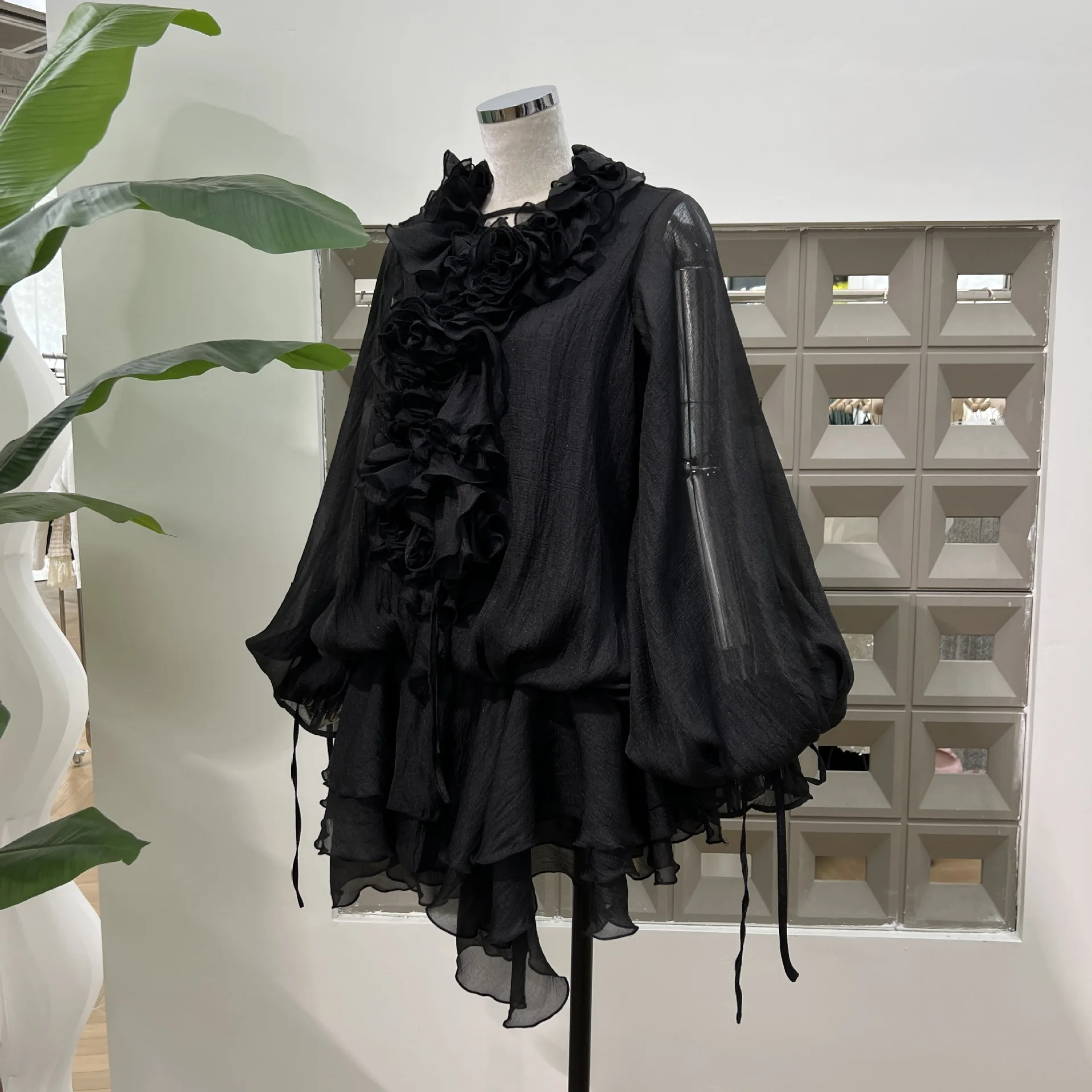 Product Name: 2025 Summer Fashion High Quality Short Casual Dress 3D Flower Lace-up Irregular Lotus Leaf Long Sleeve Plain Elegant Dress