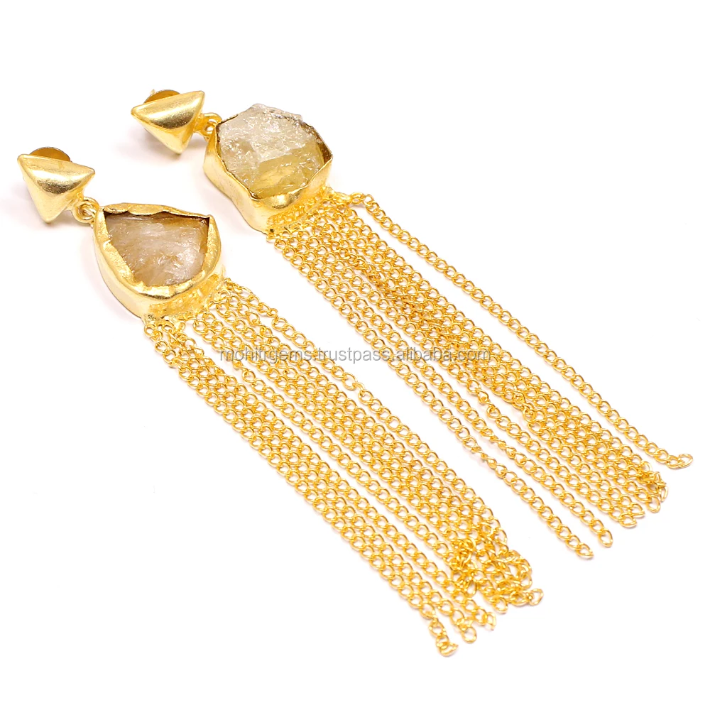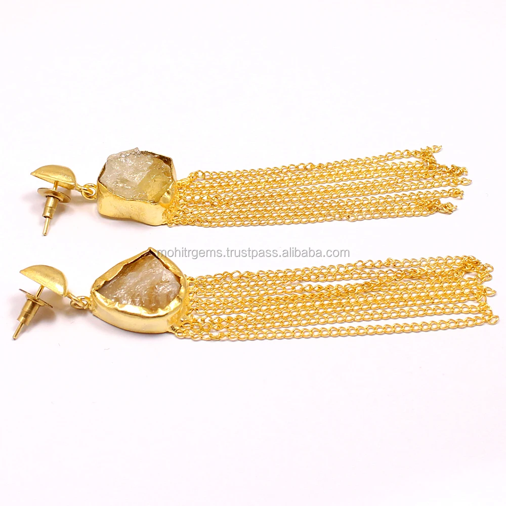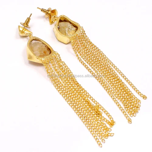 Product Name: 22 Ct Gold Plated Raw Rough Stone Tassel Statement Unique Earring Jewelry