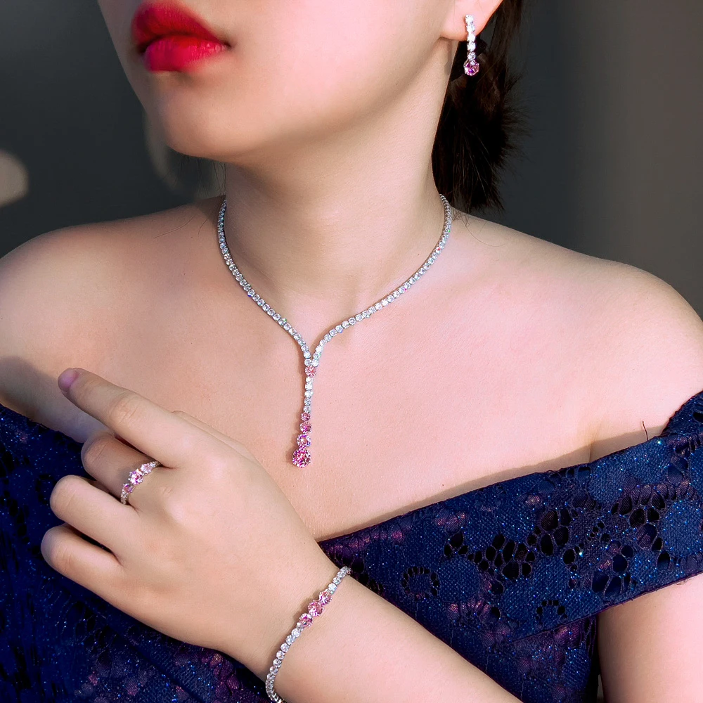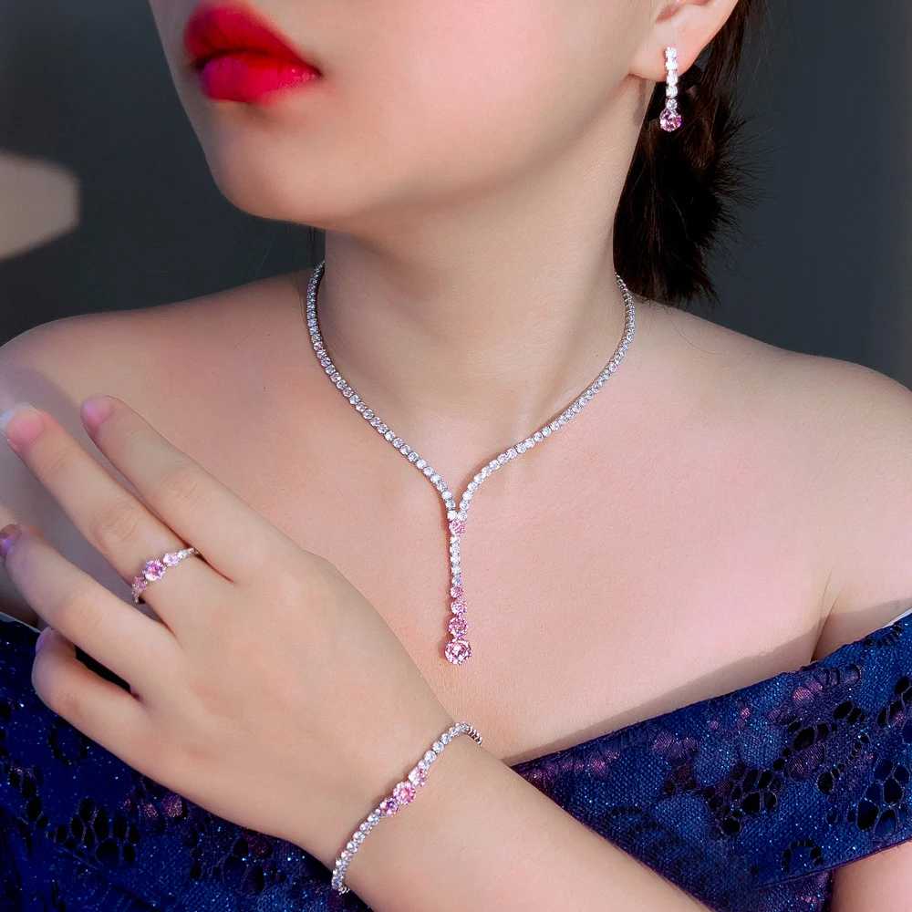 Product Name: 4pcs Glittering Cubic Zircon White Pink Necklace Earrings Bracelet and Ring Wedding Bridal Jewelry Set for Women Party Accessory