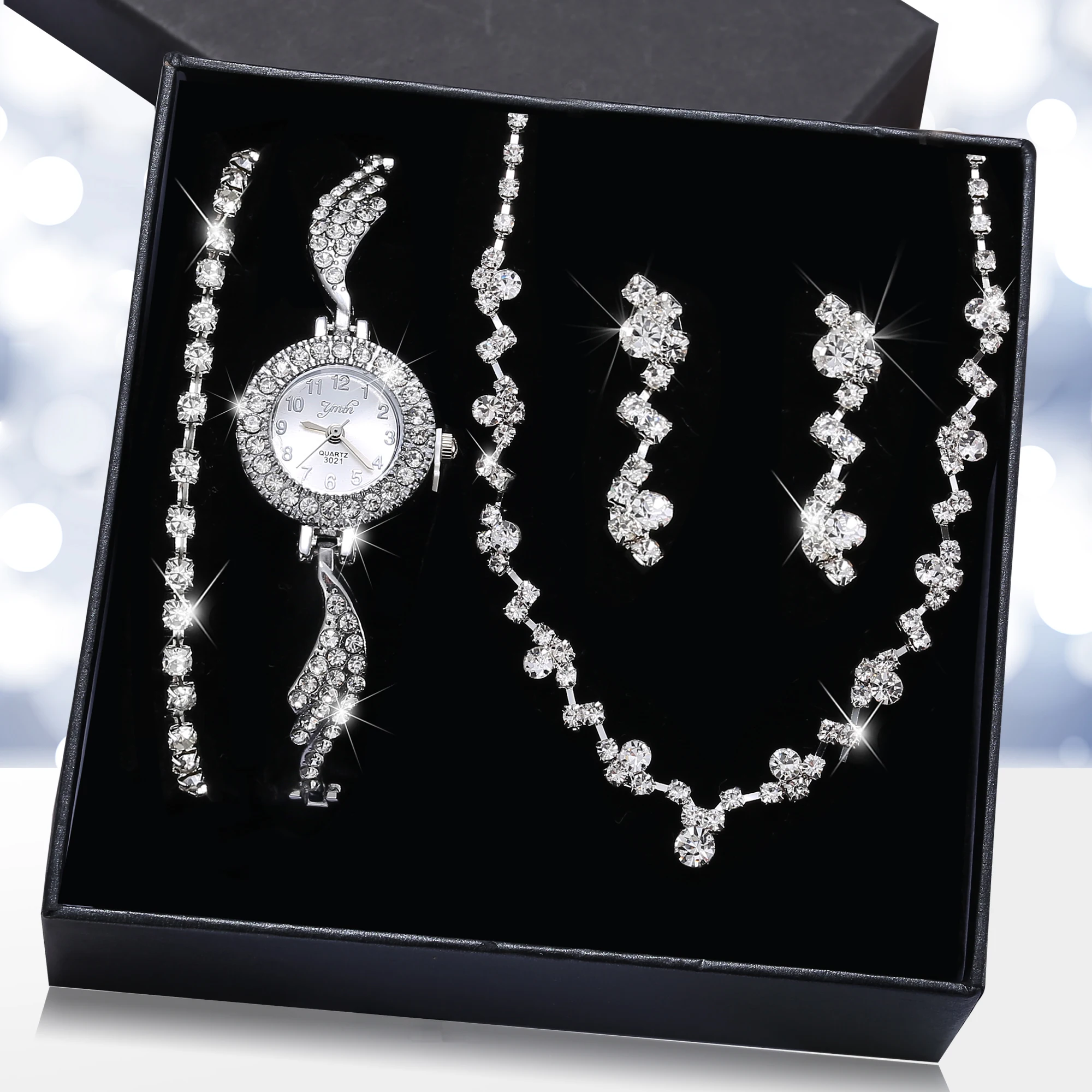 Product Name: 5pcs Fashion Luxury Full Crystal Watch Diamond Necklace Earrings Rings Bracelet Set Jewelry for Women Gift