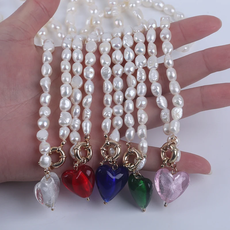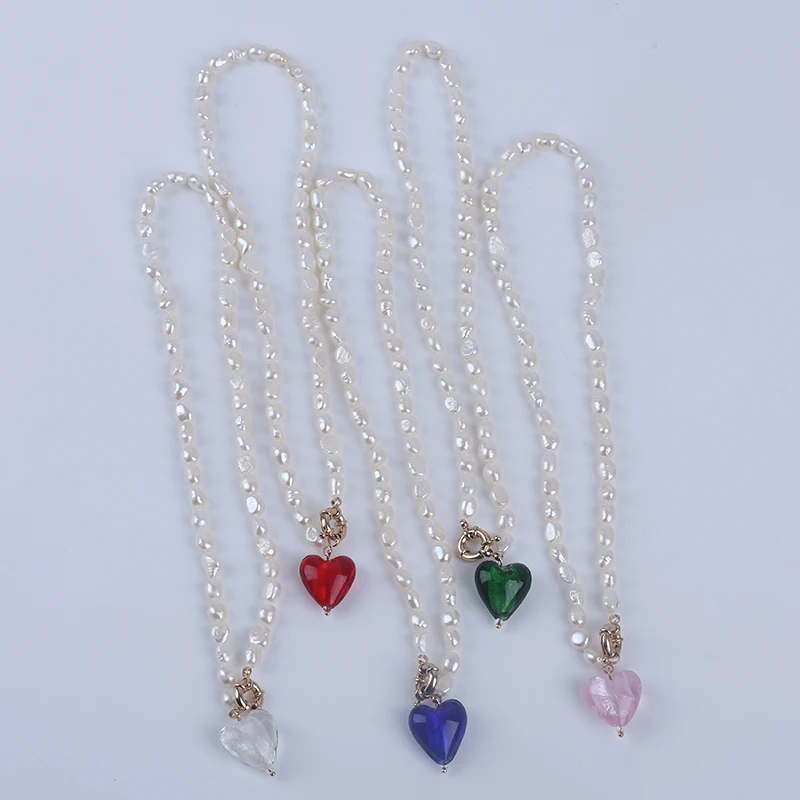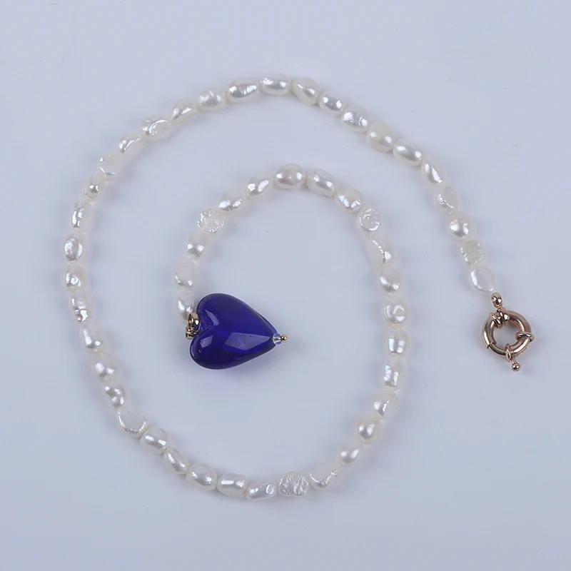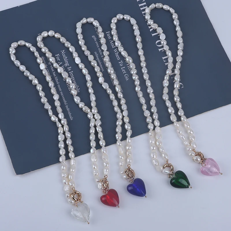 Product Name: 7-8mm White Baroque Freshwater Pearl with Glass Peach Heart Shape Pendant Necklace