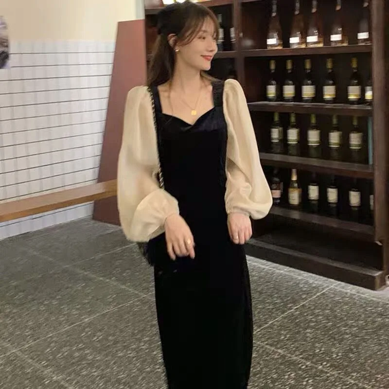 Product Name: 9886-T- Hepburn Style Thin Square Neck Slim Mesh Stitching Puff Sleeve Velvet Dress Little Black Dress Slim Casual Dresses