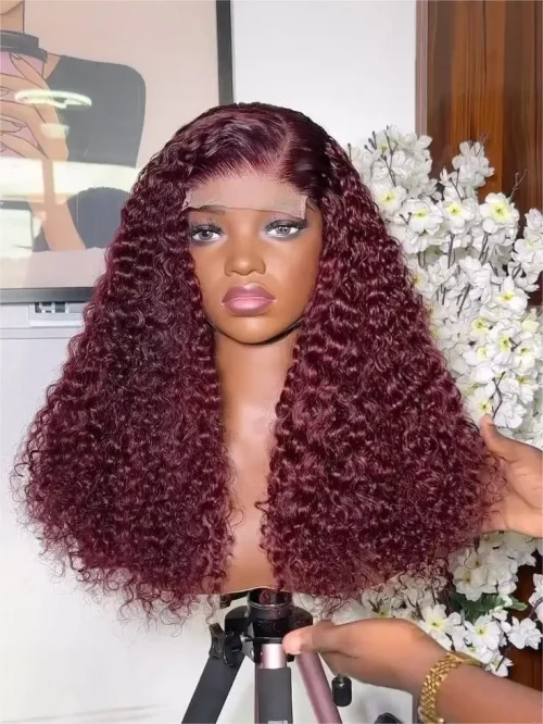 99J Wine Red Double Drawn Kinky Curly Bob 5×5 13×4 Transparent Lace Frontal Brazilian Virgin Hair Human Hair Wig