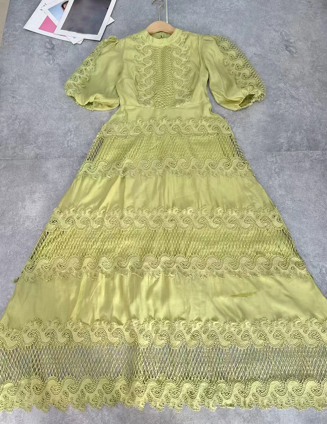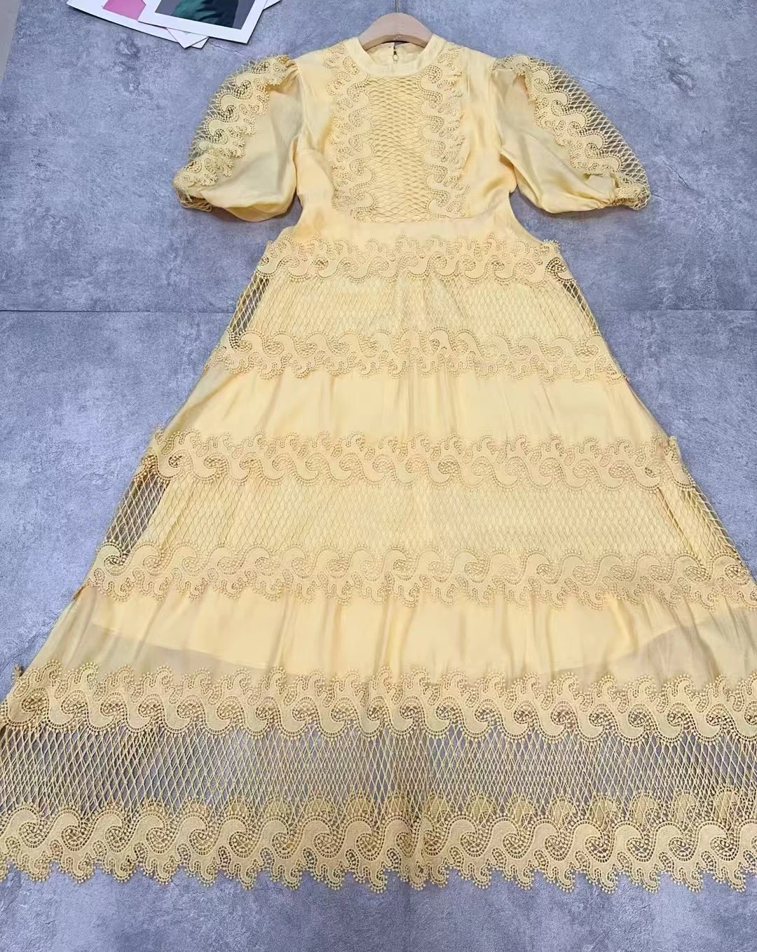 AELESEEN 2025 Spring Summer Puff Sleeve Midi Dress Women Runway Fashion Flower Embroidery Hollow Out Patchwork Elegant Casual