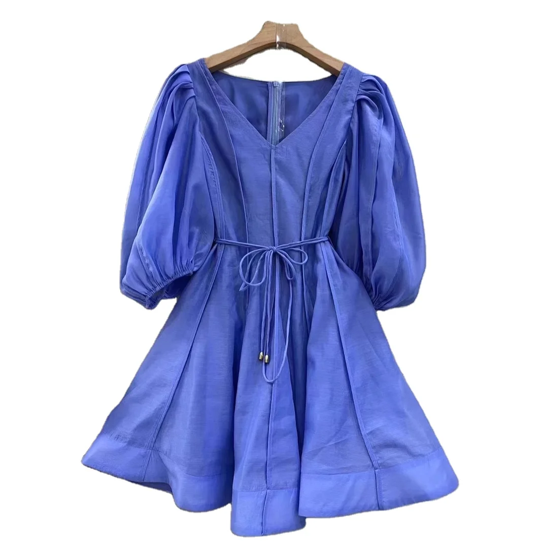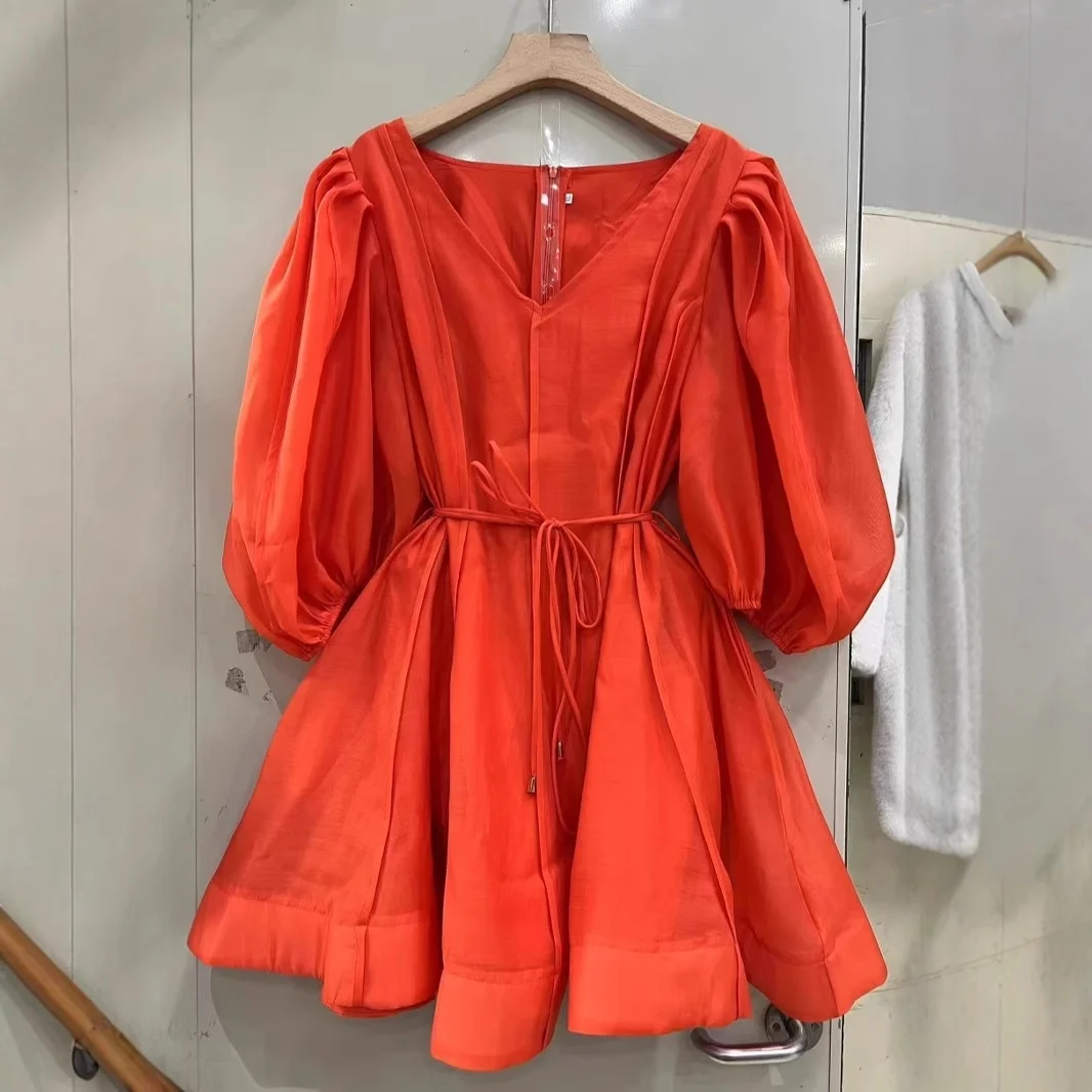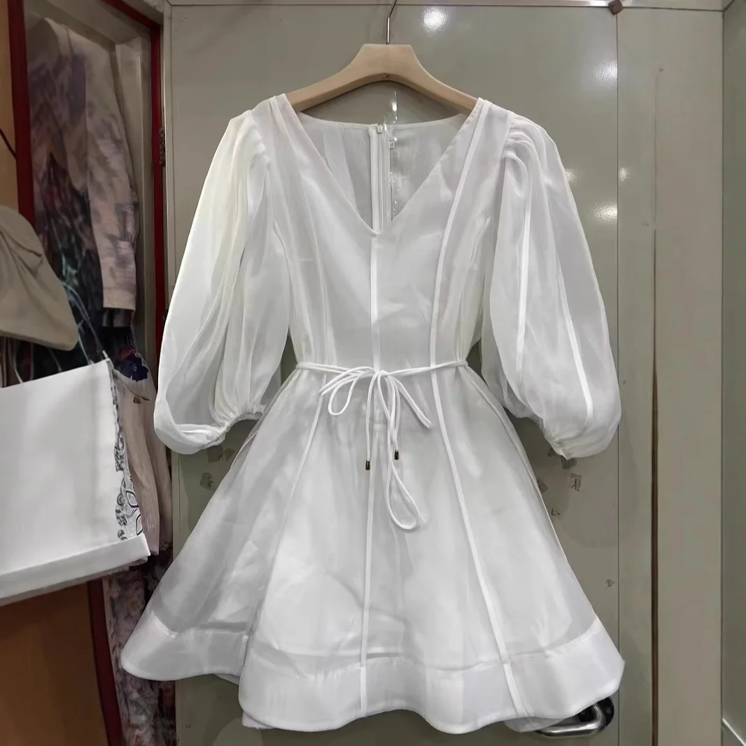 AELESEEN 2025 Summer Elegant Australian Vacation Mini Dress Women New Puff Sleeve V-Neck Loose With Belt Solid Casual