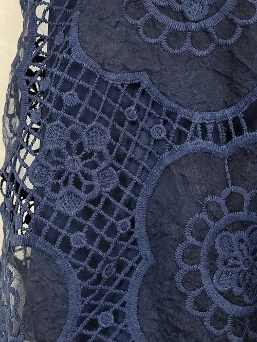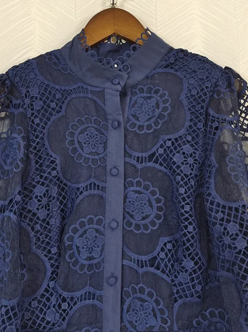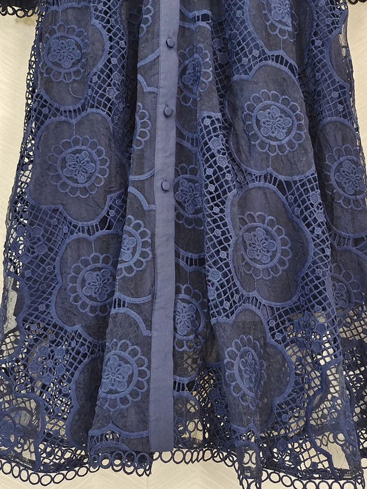Product Name: AELESEEN Designer Navy Blue Lantern Long Party Dress Women Spring Autumn Flower Embroidery Hollow Out Fashion Lace Black Belt