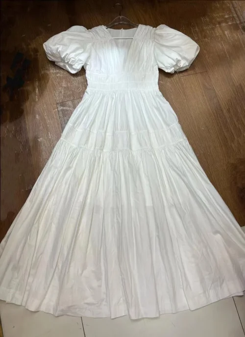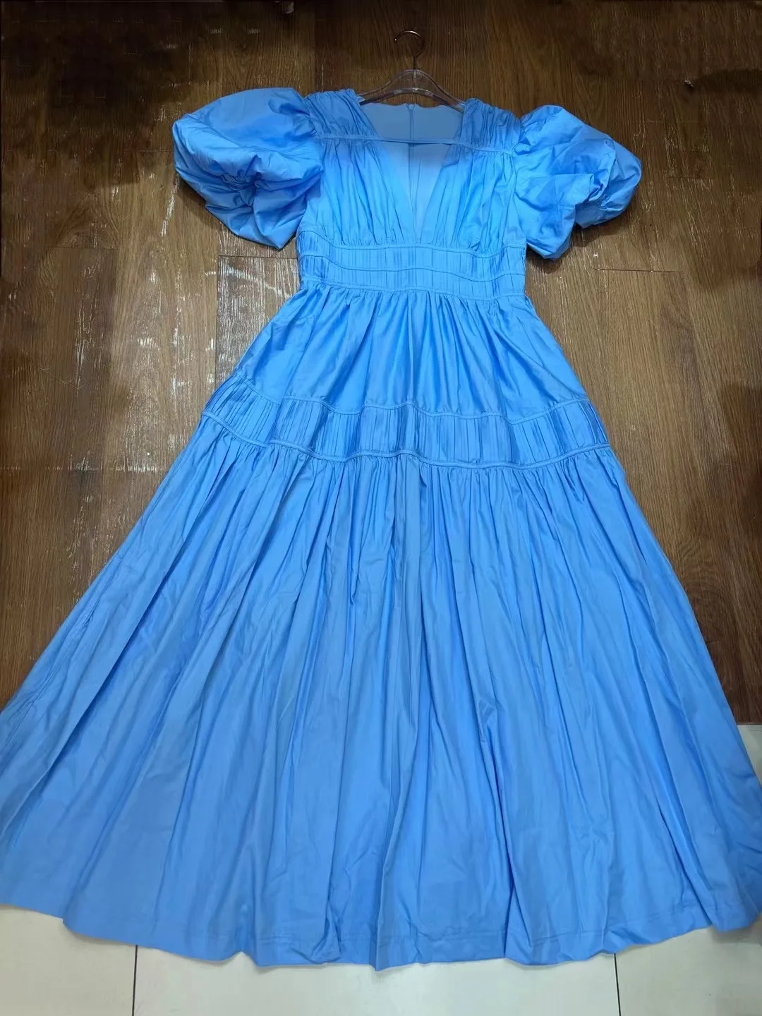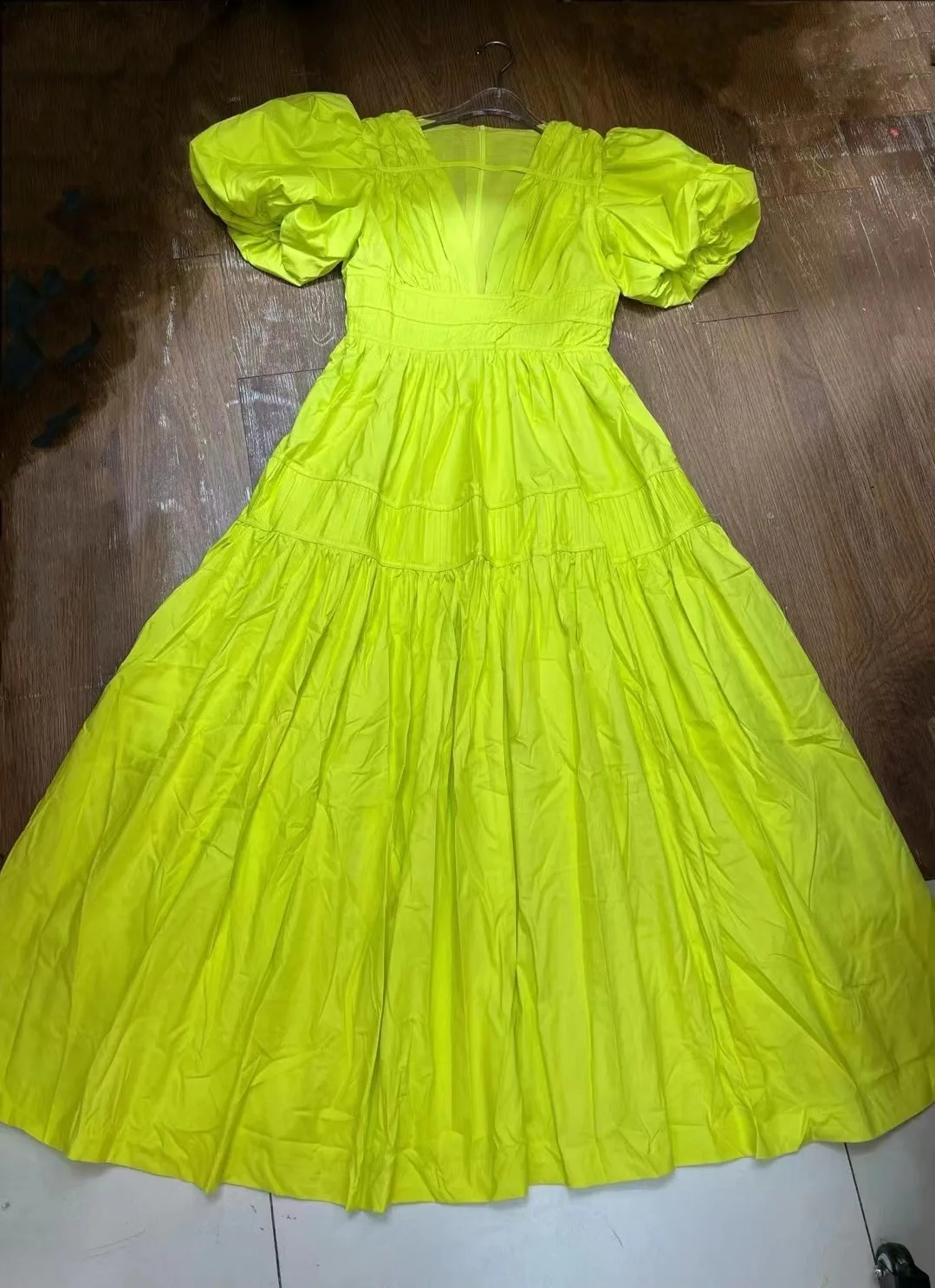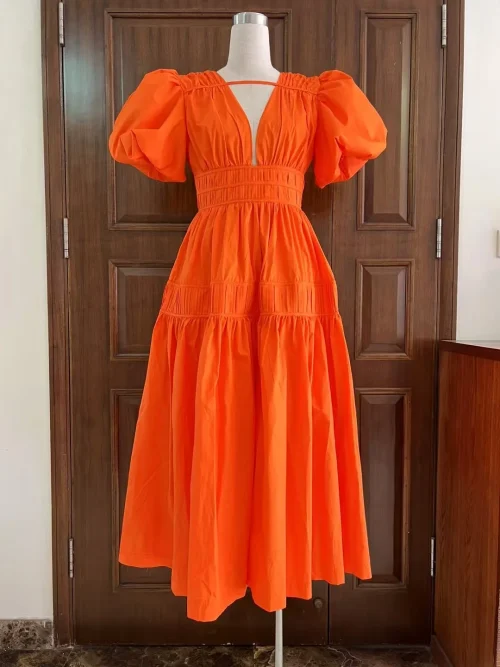 AELESEEN Retro Solid Summer Dress Women Sexy V-neck Puff Short Sleeve High Waist Pleated Elegant Fashion Party Holiday Casual