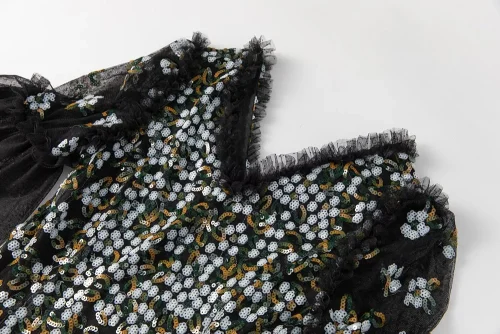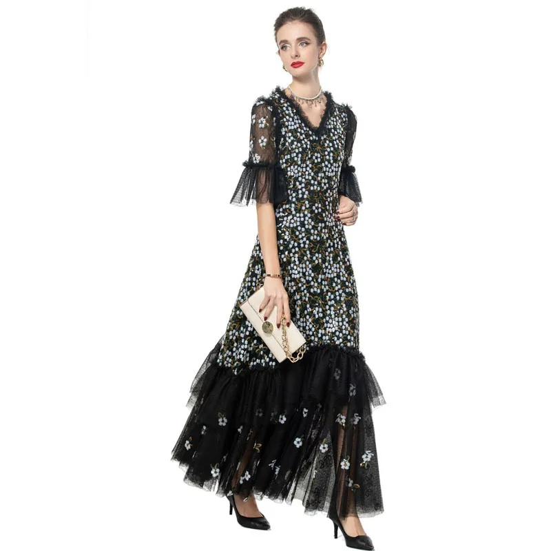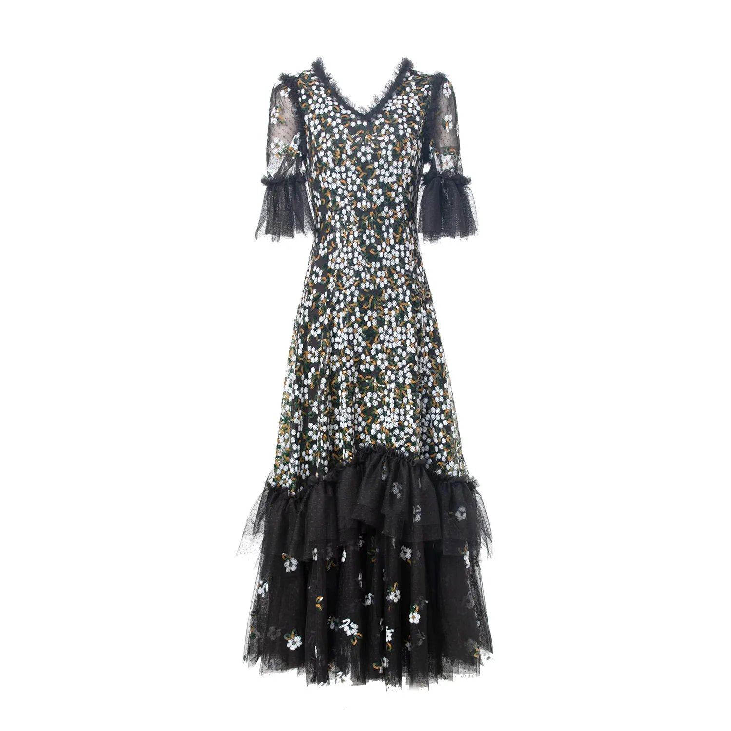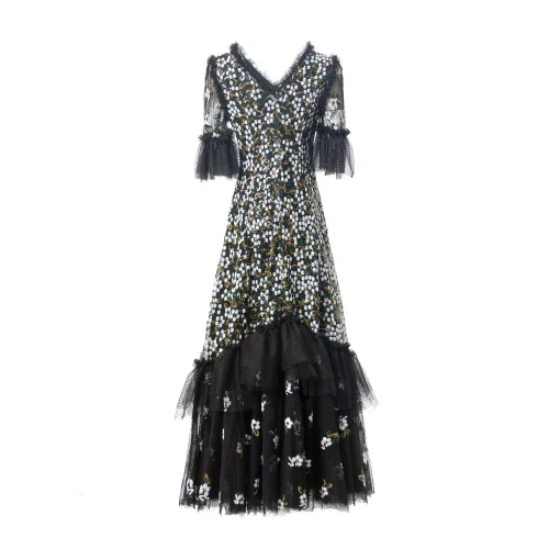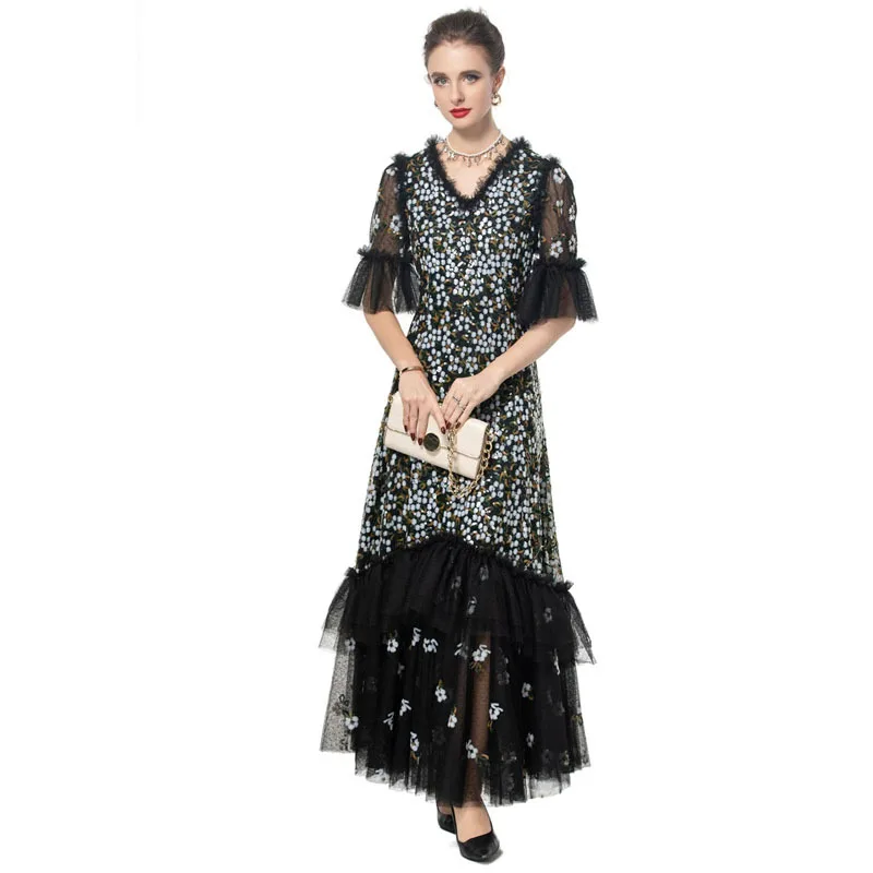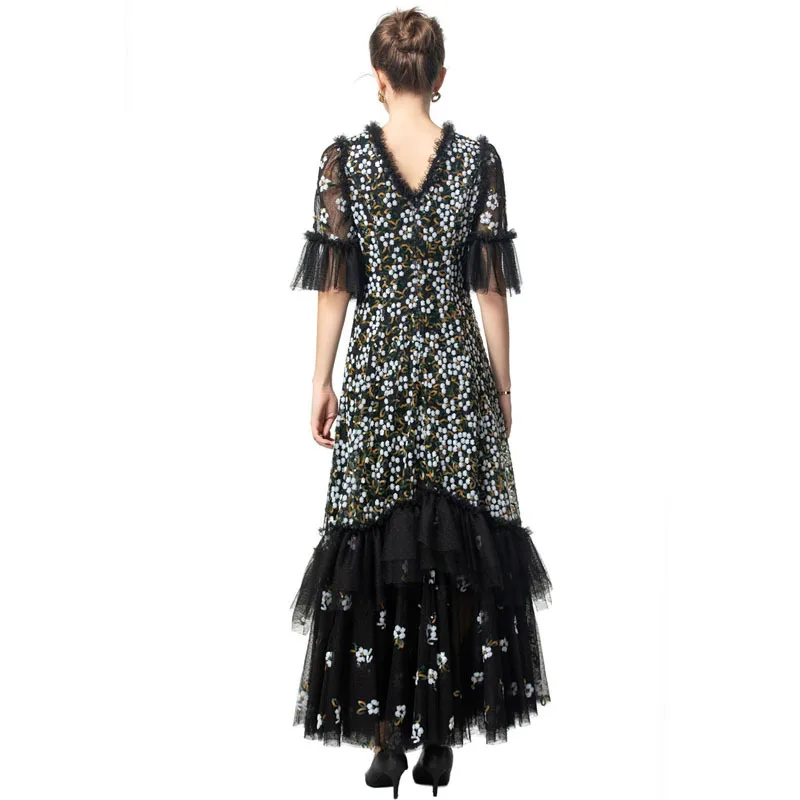 AELESEEN Sequins Embroidery Long Elegant Dress for Women V-Neck Flare Sleeve Ruffles Black Party Ruffles Prom Evening Fashion