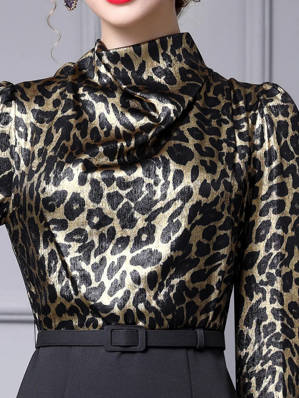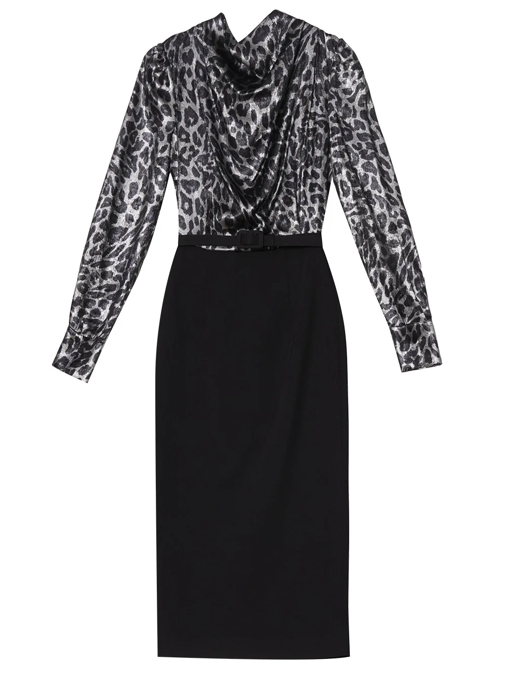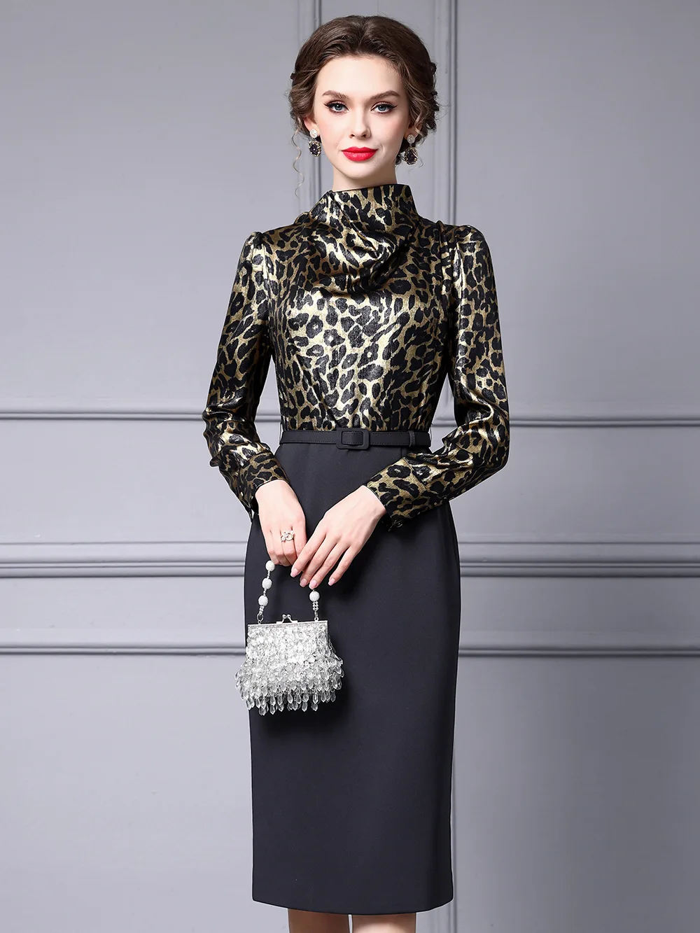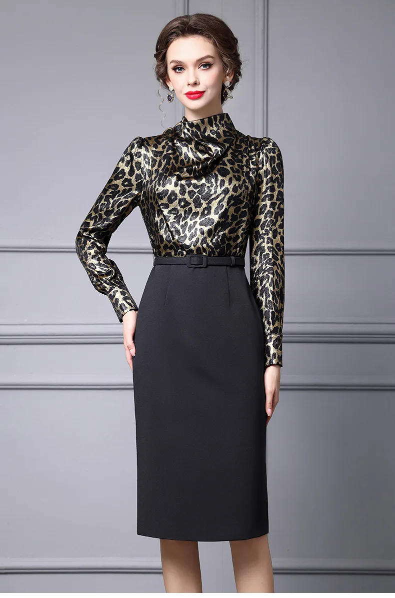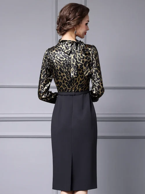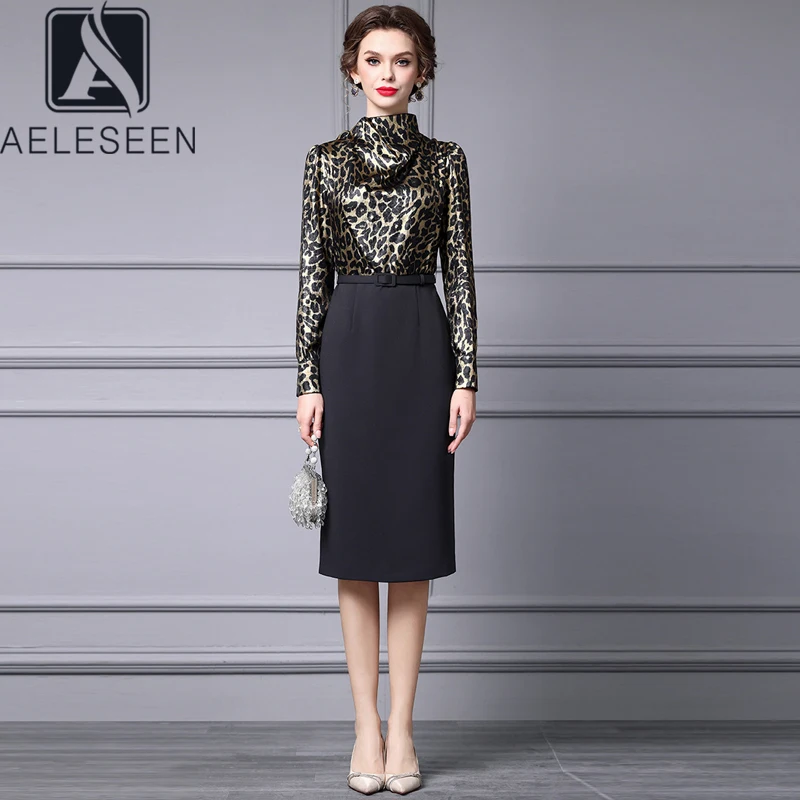 AELESEEN Slim Elegant Office Ladies Dress Women Spring New Leopard Printed Bow Patchwork Slim Midi Working Career Vestidos