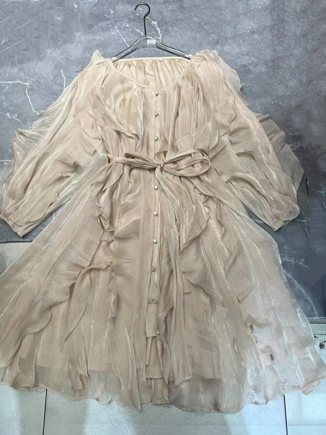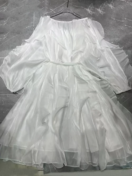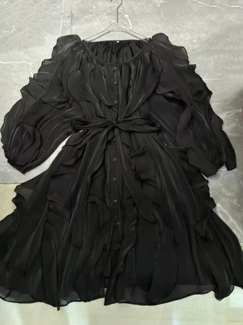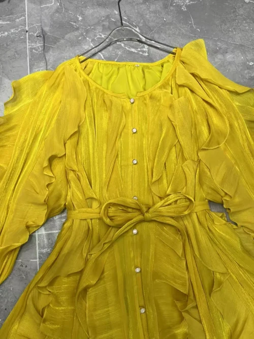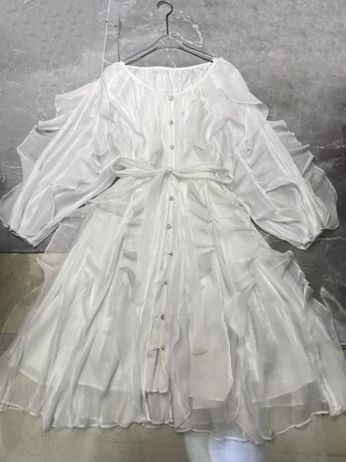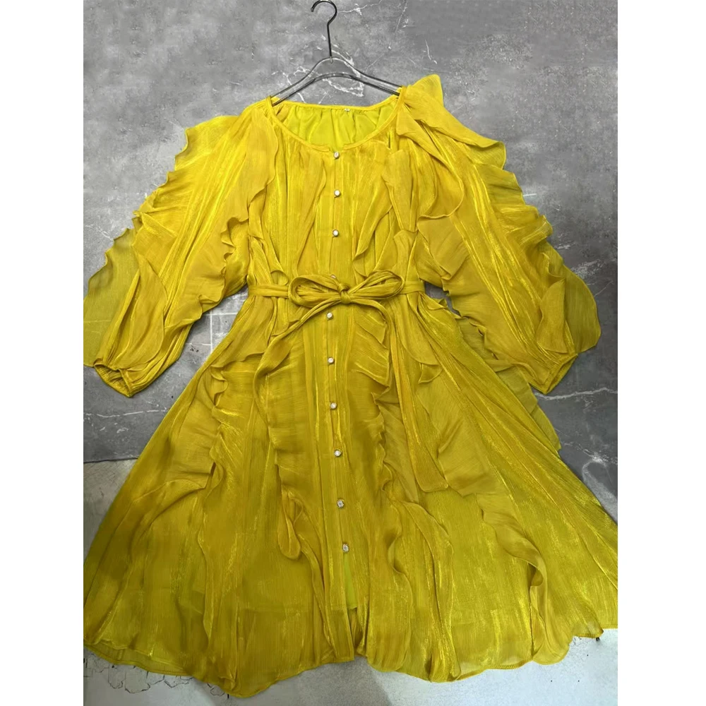 Product Name: AELESEEN Spring Summer New Elegant O-Neck Lantern Sleeve Tie Rope Mini Sun Dress Women’s Solid Color Fold Casual Dresses