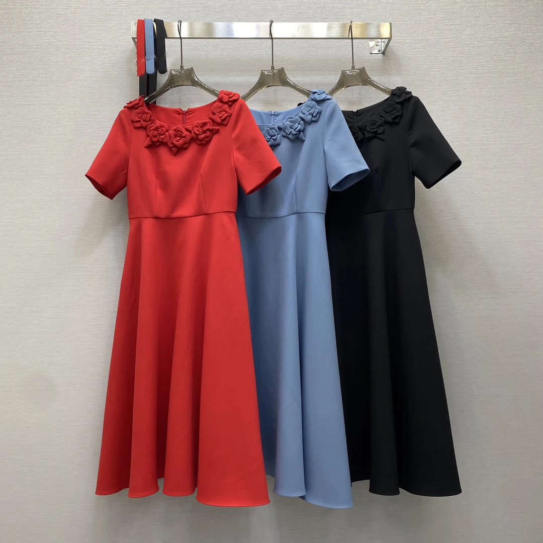 Product Name: AELESEEN Spring Summer Women’s New Temperament 3D Appliques Flower O-neck Short Sleeved Dress Belt Swing Fashion Long Party