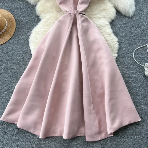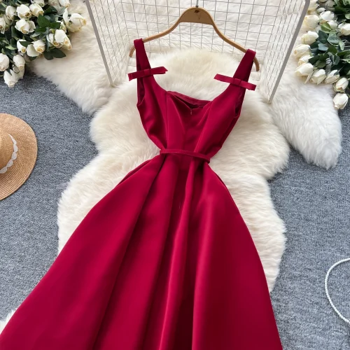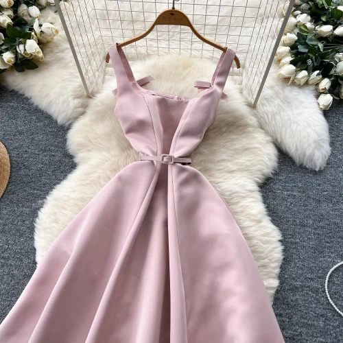 Audrey Hepburn Style Dress French Elegant Square Neck Bow Tie Sundress with Flared Skirt & Corset Waist, Summer Party Gown
