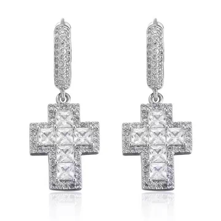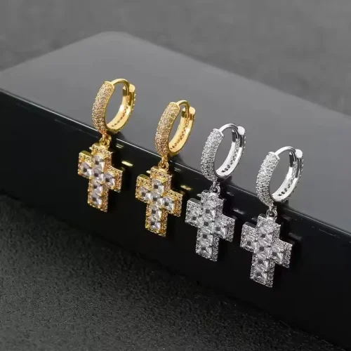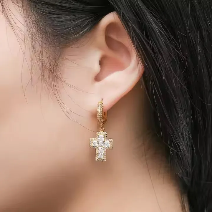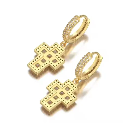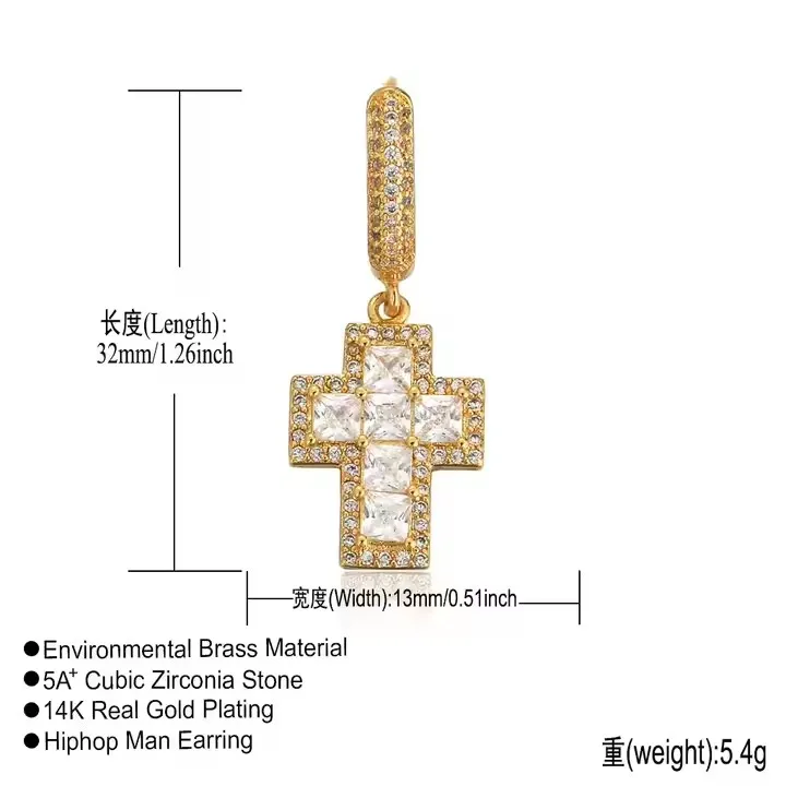 BES Fashion Hip Hop Personality Cross Shape Earring Iced Out Cubic Zircon Gold Plated Earring Jewelry for Anniversary or Parties