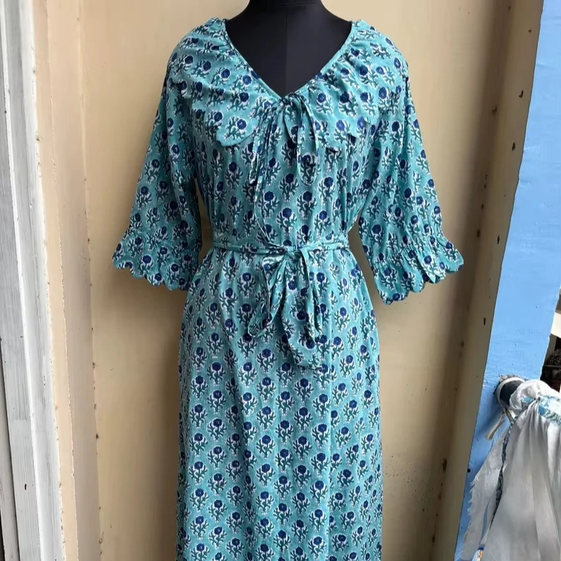 Product Name: Blue Hand Block Printed Dress Block Print Indian Tunics Hand Dress Indian Cotton Long Gown Indian Printed Dress