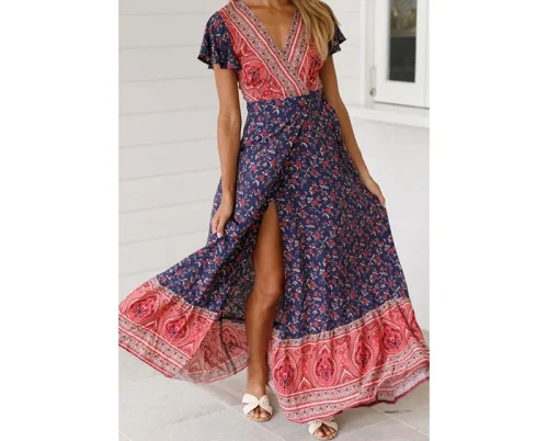 Product Name: Bohemian Chic V-Neck Slit Maxi Dress Sexy Floral Print Beach Sundress for Women Casual Summer Tropical Vacation Dresses